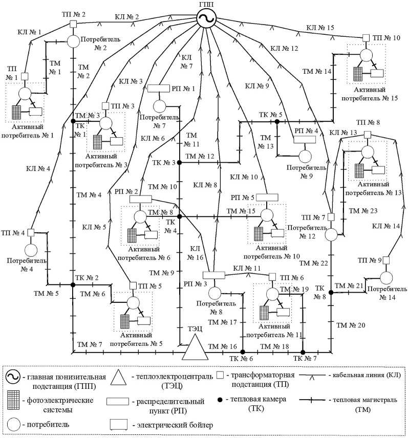 Предложенный в статье методический подход использован для программной реализации прототипа программной платформы для решения задач проектирования ИЭС. На базе платформы построен цифровой двойник ИЭС одного из районов г. Иркутска. Расчетная схема системы представлена на рис. 6. За основу взяты действующие в настоящее время системы электроснабжения и отопления. Кроме того, для рассмотрения одного из возможных вариантов их развития в схему включены активные потребители с их источниками электрической и тепловой энергии. Представленная схема включает в себя следующие субъекты: семь обычных потребителей; восемь активных потребителей; восемь электрических бойлеров для выработки тепла; восемь фотоэлектрических систем для выработки электроэнергии; шестнадцать кабельных линий; двадцать три тепловые магистрали; один централизованный источник электрической энергии и один централизованный источник тепловой энергии.