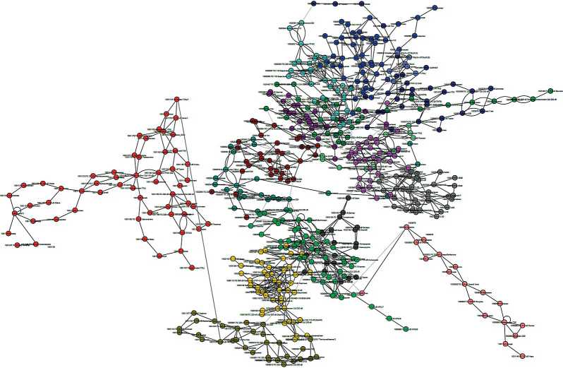 В настоящее время разработано достаточно большое количество алгоритмов кластеризации в наборах данных [10–12], каждый из которых обладает своей спецификой, имеет свои достоинства и недостатки. Особняком стоят методы и адаптации методов, позволяющие работать в сети взаимосвязанных элементов, другими словами – в графах. Наличие взаимосвязей между кластеризуемыми объектами значительно влияет на получаемый результат и накладывает определенные ограничения. Существует множество методов кластеризации на графах, которые могут быть использованы в рамках сетевого анализа. Некоторые из них являются модификациями стандартных методов кластеризации, таких как метод k-средних, спектральная кластеризация и имеют адаптации для работы с графами.