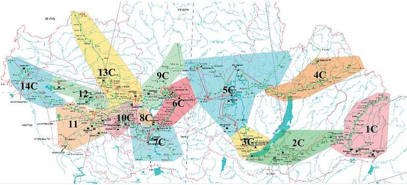 Рис. 3. Результат кластеризации ОЭС Сибири на ЗН на основании применения алгоритма Лейдена (географическая привязка).