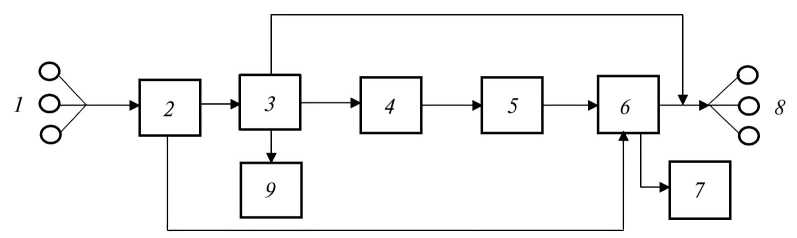 Рис. 5. Комбинированная технологическая схема утилизации биомассы и геотермальной энергии: 1 –добычные скважины; 2 – ГЦТП; 3 – метантенк; 4 – газгольдер; 5 – ГТУ; 6 – ГПЭС; 7 – блок по выращиванию белково–витаминной биомассы; 8 – нагнетательные скважины; 9 – обеззараженные удобрения.