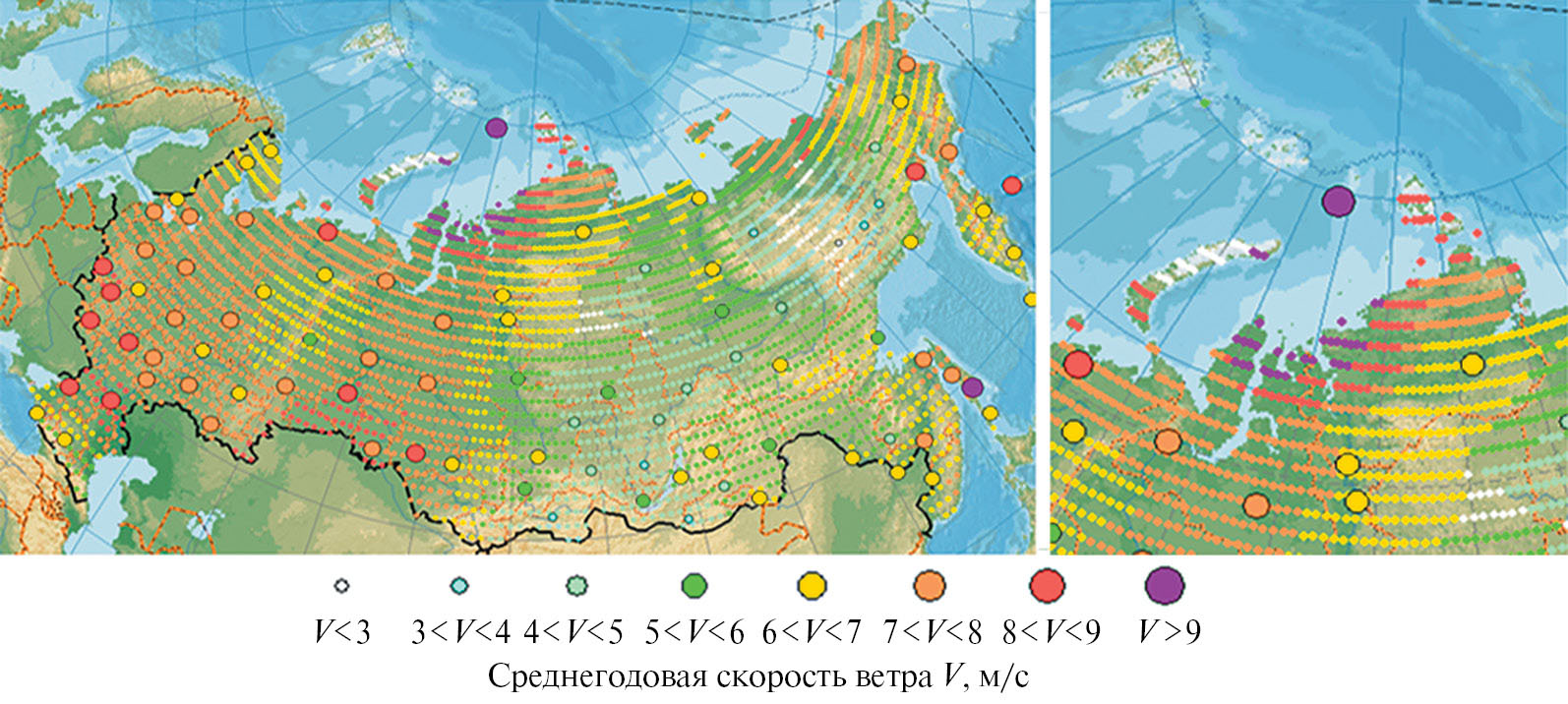 Рис. 1. Среднегодовая скорость ветра на высоте 100 м по данным аэрологических станций.