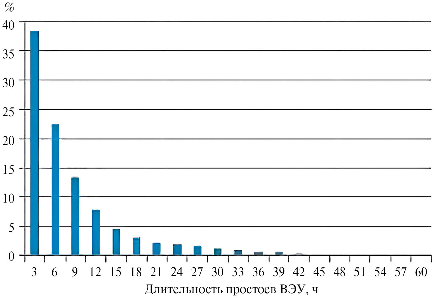 Необходимым параметром при выборе емкости системы аккумулирования энергии для ВЭУ и ВЭС и при технико-экономических расчетах являются вероятности и длительности периодов их простоев из-за ветровых штилей и слабом ветре (для современных ВЭУ ≤ 4 м/с). Пример результатов расчета этих параметров для ВЭУ Gamesa 8000 дан на рис. 4.