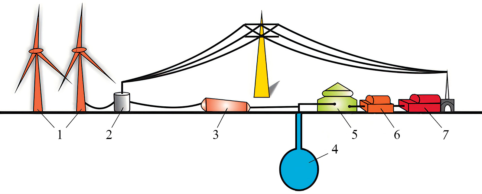 Рис. 6. Схема ВЭС в сочетании с ПАВ и ВТУ: 1 ‒ ВЭС; 2 ‒ трансформатор; 3 ‒ воздушный компрессор; 4 ‒ подземный аккумулятор воздуха; 5 ‒ осушитель воздуха; 6 ‒ воздушная турбина; 7 ‒ генератор электроэнергии.