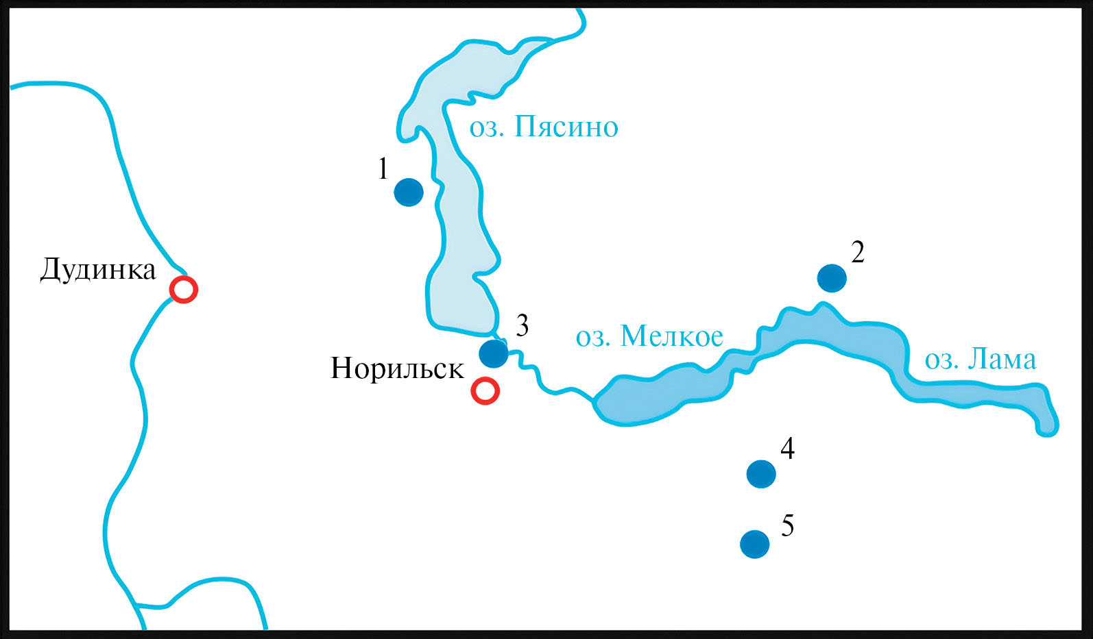 Рис. 9. Местоположение вскрытых скважинами залежей каменной соли в северо-западной части Сибирской платформы (по П.И. Соколову, 1975,1977): 🔵 – скважины, вскрывающие залежи каменной соли.