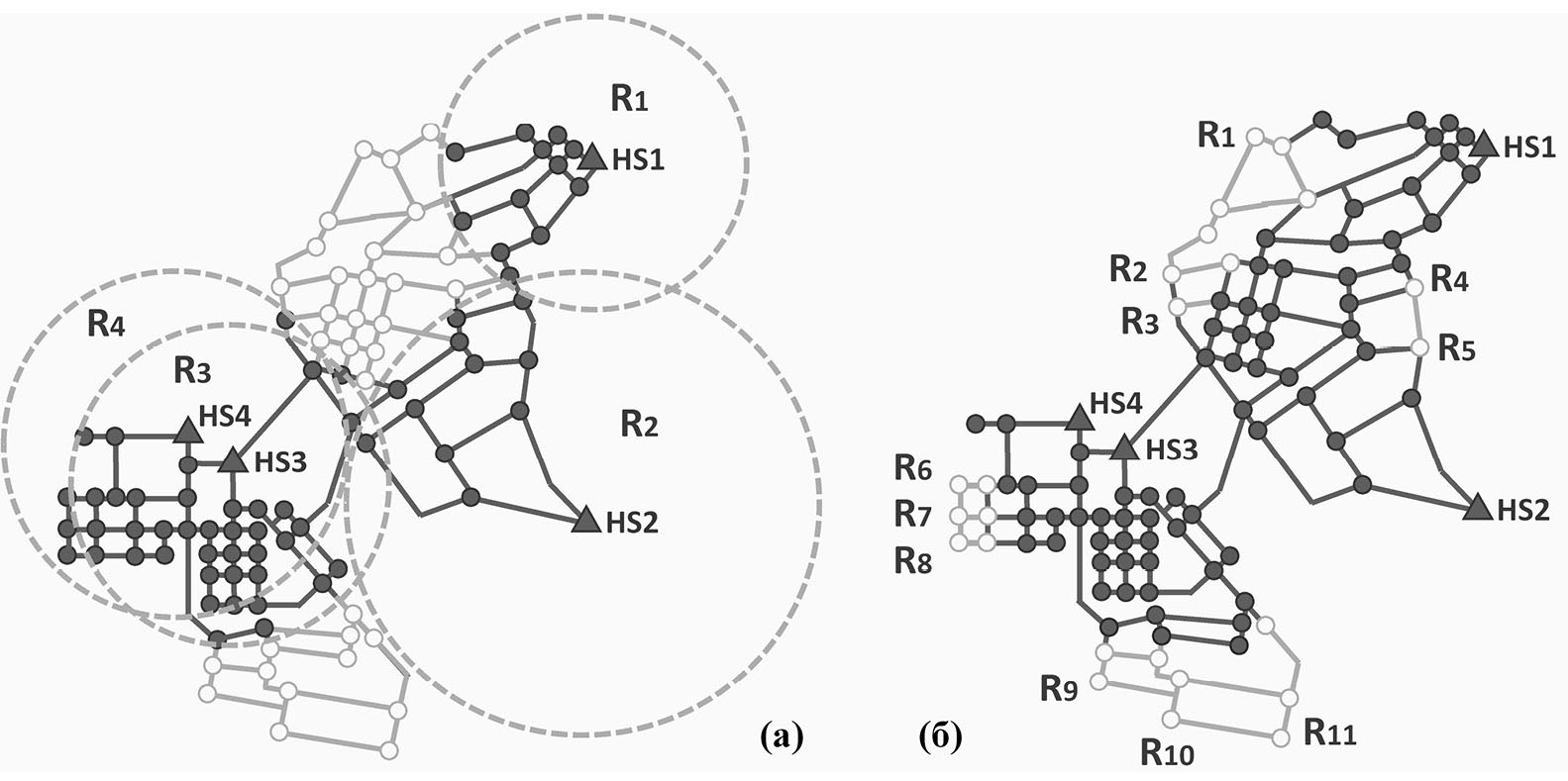 Рис. 1. Иллюстрация методов определения границ эффективности теплоснабжения в ТСС на основе критерия РЭТ: (а) интегральный подход – для каждого ИТ определен единый радиус из предположения о равномерности распределения тепловой нагрузки; (б) предлагаемый узловой подход – решения получены по узлам каждой магистрали от источников системы.