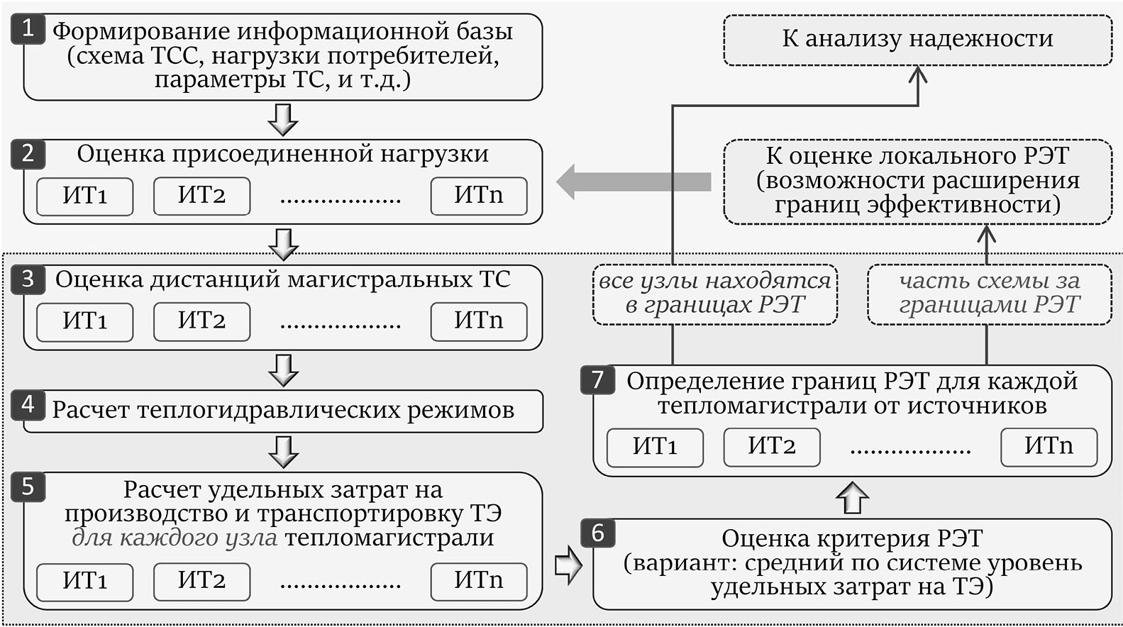Далее, при условии, что все узлы находятся в границах РЭТ, осуществляется переход к анализу надежности системы (п. 3). В противном случае для частей схемы, выходящих за границы системного РЭТ, проводится оценка так называемого локального РЭТ [19], в результате которой определяются возможности по расширению границ эффективности теплоснабжения в пределах централизованной системы. Все математические модели, используемые в описанной методике, подробно рассмотрены в публикациях [20–22].