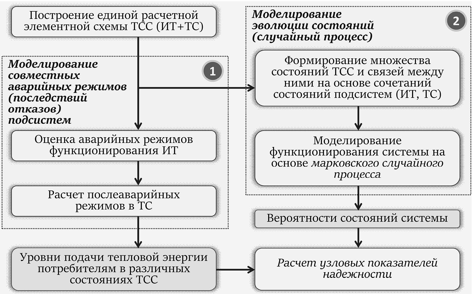 Мы предлагаем комплексный подход, состоящий в определении интегрального воздействия объектов подсистем ТСС на надежность теплоснабжения потребителей. Общая схема методики анализа надежности, основанной на этом подходе, приведена на рис. 3. Комплекс задач анализа надежности и методов их решения разделен на два основных блока (рис. 3): физическое (блок 1) и вероятностное (блок 2) моделирование функционирования системы. Основной для моделирования служит единая элементная расчетная схема ТСС, полученная путем объединения схем ИТ и ТС. Множество состояний ТСC формируется как сочетание состояний его подсистем с учетом технологической возможности их реализации. Оценка вероятностей состояний ТСC производится с учетом заданных параметров надежности элементов (интенсивностей отказов и восстановлений) на основе модели марковского случайного процесса [23, 24]. Оценка аварийных режимов системы заключается в расчете соответствующих теплогидравлических режимов в ТС, моделируемых на основе моделей теории гидравлических цепей [16] с учетом совместимых отказов ИТ. Итоговый результат составляют узловые ПН, рассчитываемые с использованием ранее полученных результатов вероятностного моделирования состояний и оценки соответствующих аварийных режимов (см. рис. 3). Основными ПН являются коэффициент готовности и вероятность безотказной работы, для которых установлены требуемые значения [23, 25]. Методология комплексного анализа надежности ТСС и ее практические приложения подробно изложены в работах [26–30].