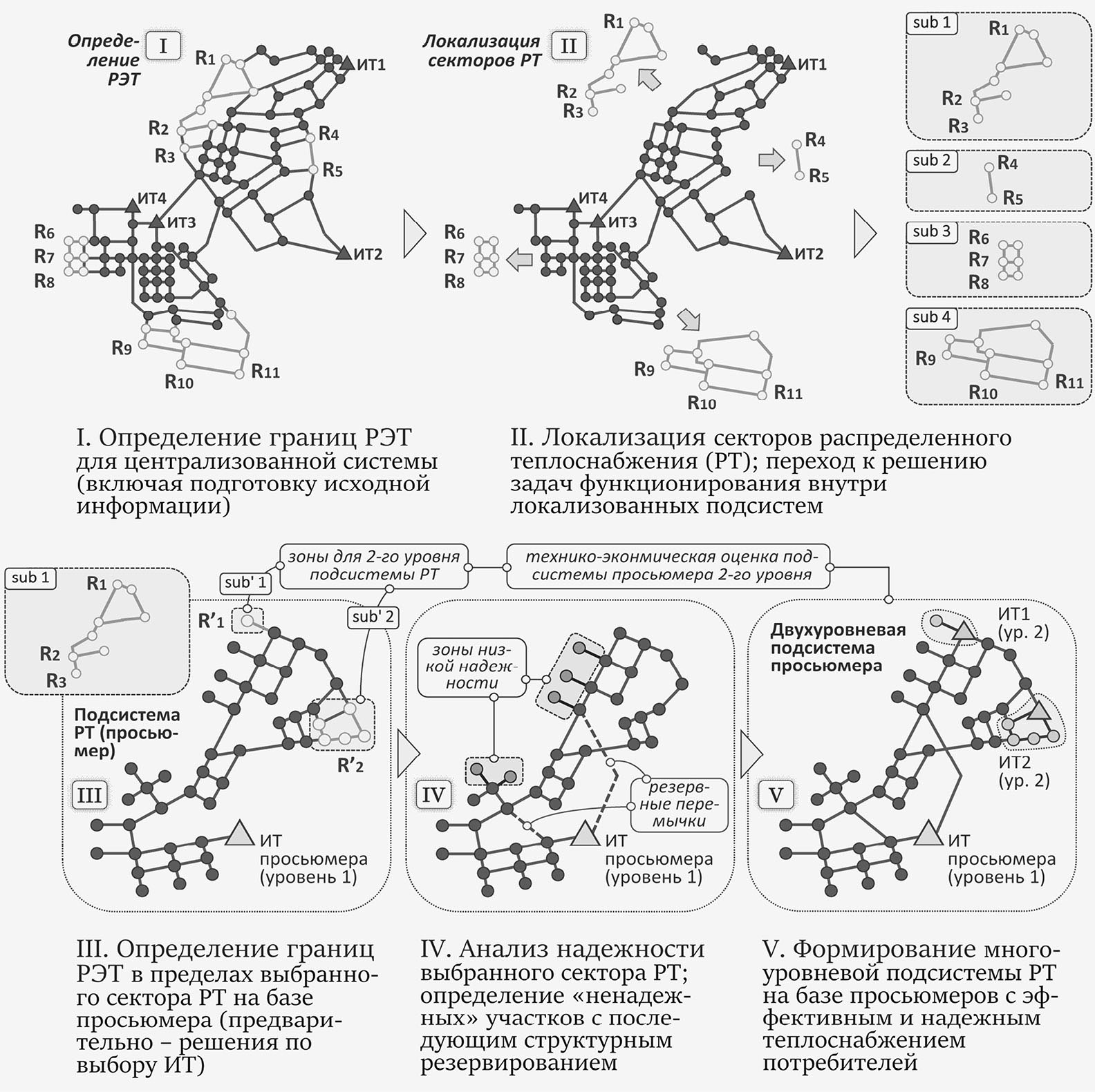 Этап III соответствует определению границ РЭТ в пределах выбранного распределенного сектора на базе просьюмера. При наличии потребителей, находящихся за этими границами, предполагается их подключение к источнику второго уровня РТ: таким образом формируется двухуровневая (в общем случае многоуровневая) иерархическая структура со своими просьюмерами на каждом уровне. На этапе IV решается задача анализа надежности в полученных границах эффективности выбранного сектора с выявлением “ненадежных” узлов и последующим их резервированием. На этапе V формируется итоговая многоуровневая подсистема распределенного теплоснабжения на базе просьюмеров с эффективным и надежным теплоснабжением потребителей. Применяемые методы и модели имеют определенные допущения, а предложенный алгоритм не рассматривается как завершенный этап исследований, но они позволяют в “первом приближении” эффективно решать поставленные методические и практические задачи.
