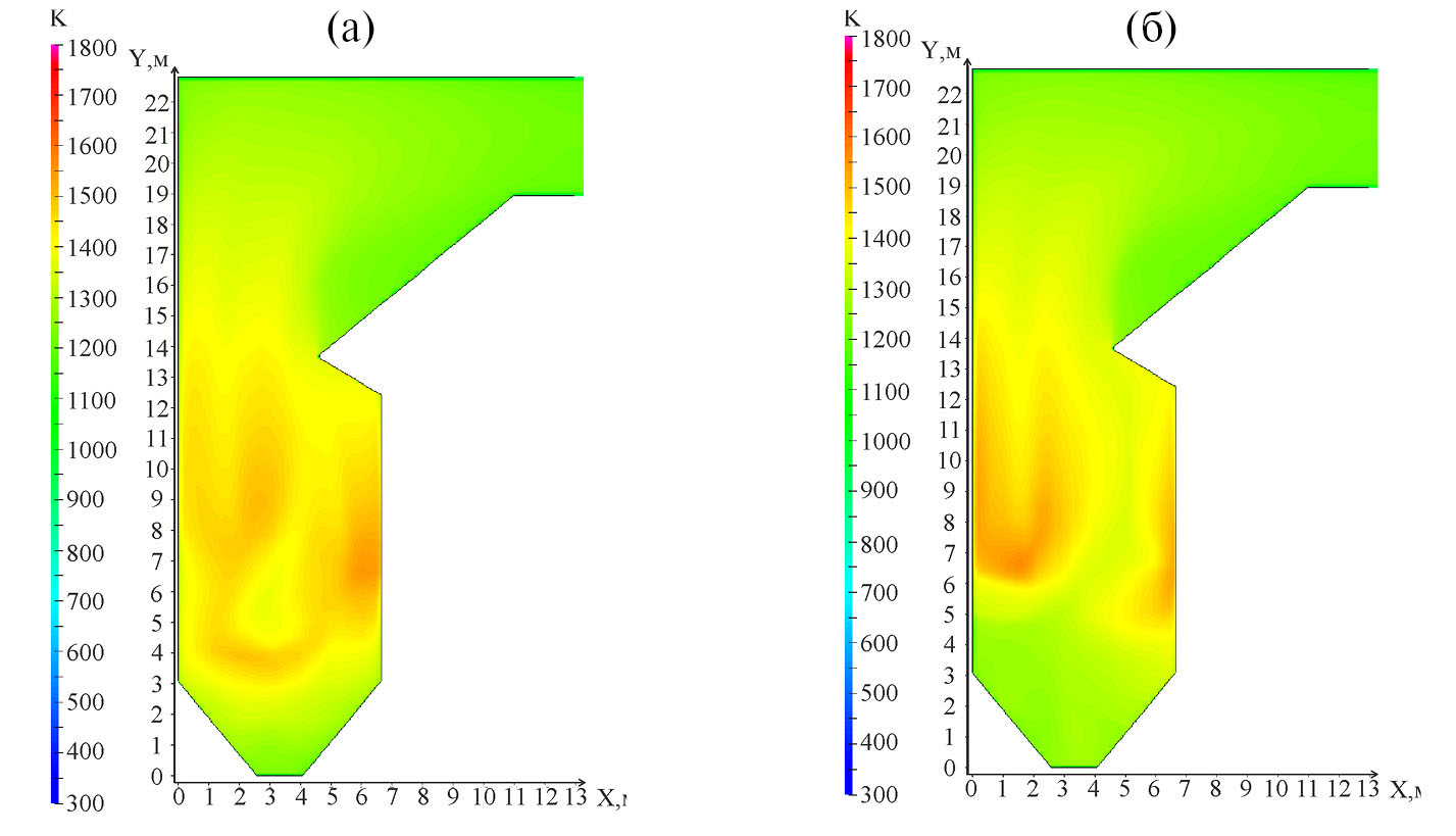 Рис. 4. Распределение температуры в вертикальном сечении по продольной оси топки (К): (a) MLU; (б) QUICK.