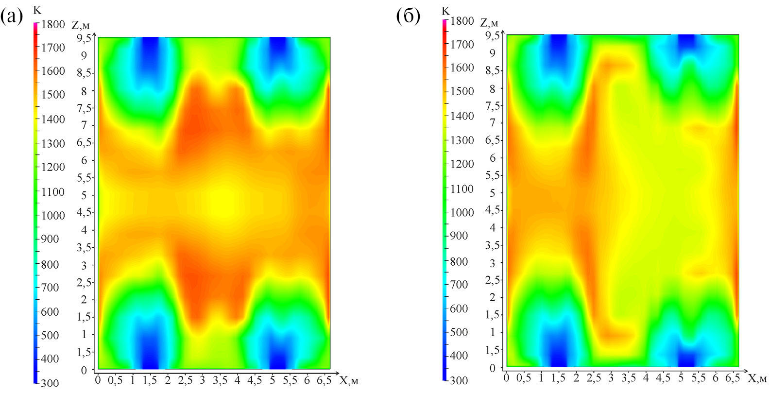 Рис. 5. Распределение температуры в горизонтальном сечении по оси верхнего яруса горелок (К): (a) MLU; (б) QUICK.