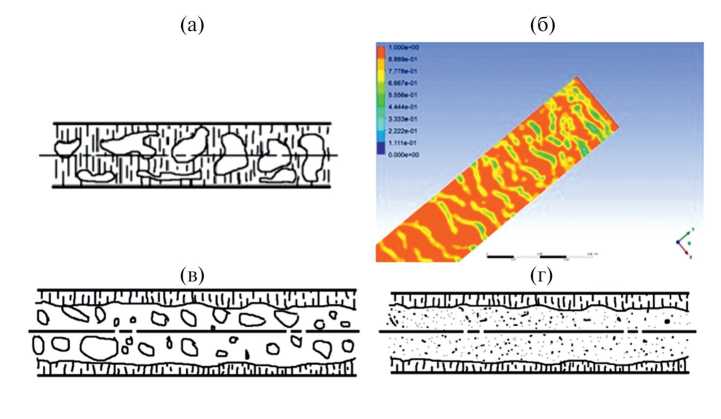 Рис. 3. (а) Эмульсионный режим течения парожидкостной смеси; (б) Доля жидкостной фазы в сечении трубки; (в) Кольцевой режим течения (пар внутри жидкости); (г) Дисперсный режим течения (капли внутри пара).