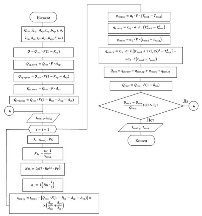 Первую часть представляется в виде блок-схемы на рис. 4 по методу Гаусса (с вводом исходных данных, прямым и обратным ходом, выводом результатов). Как итог рассчитывается температура на поверхности ФЭП с погрешностью менее 0.1%. Результаты с температурой окружающей среды в 20°С и ветром 1 м/с сводятся в табл. 1.