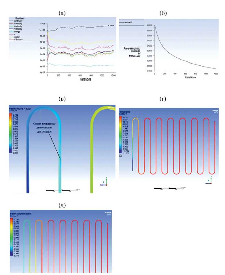 На рис. 7 показаны основные результаты численного моделирования в пост-процессинге. На рис.7а видно, что из-за нестабильности процесса сходимость протекает медленно. Однако на рис.7б, в, г, д показаны итоги по температурам и долям жидкой и паровой фаз фреона.