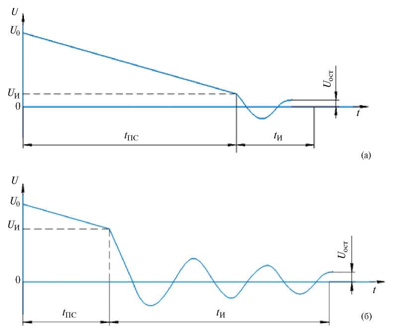На рис. 1 (а, б) обозначено: tПС – длительность подготовительной стадии разряда; UИ – напряжение на накопительном конденсаторе в момент перехода подготовительной стадии разряда в искровую; UОСТ – остаточное напряжение на конденсаторе после погасания разряда. Сравнение осциллограмм показывает, что величина tПС может меняться кратно, нестабильным остается и параметр UОСТ.