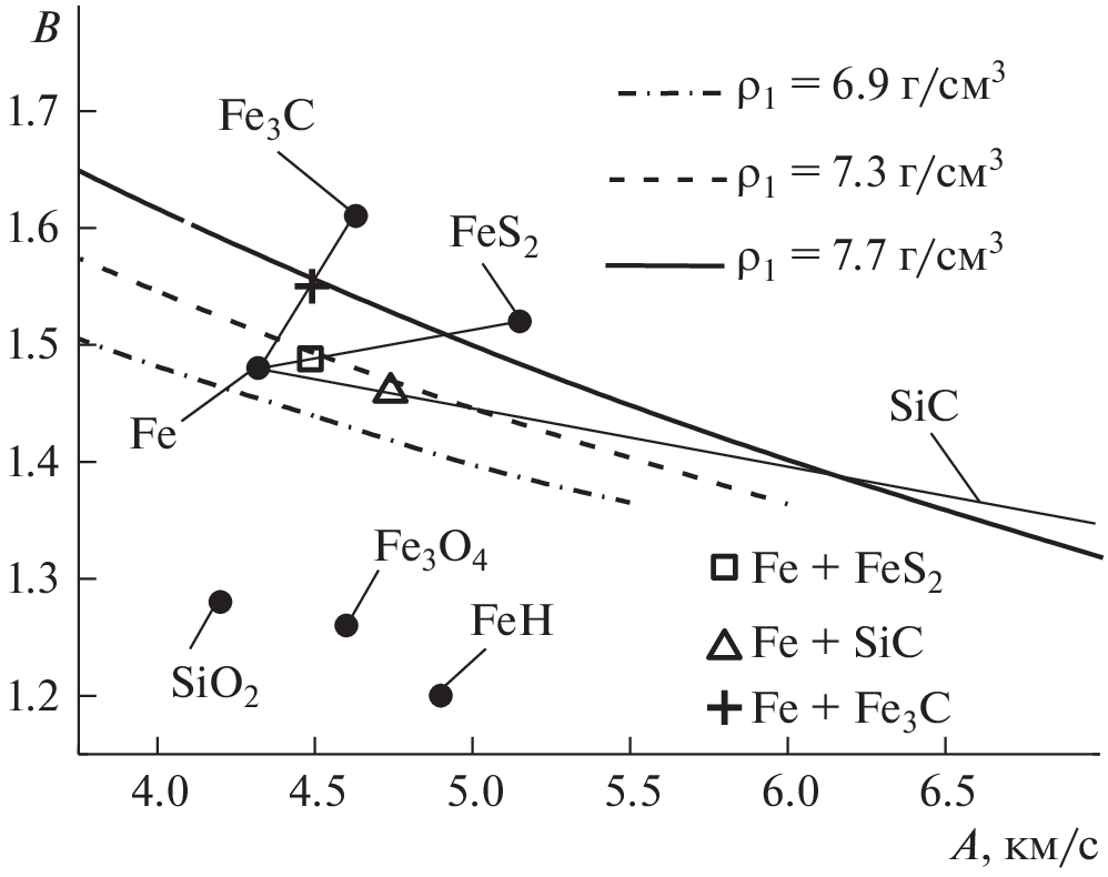 Предложены согласующиеся с экспериментальными данными выражения для вычисления скорости звука и температуры конденсированной среды при давлениях внешнего жидкого ядра Земли через параметры ударной адиабаты среды. Добавки во внешнем жидком железоникелевом ядре Земли подбирались так, чтобы расчетные давление, плотность и скорость звуковых волн соответствовали геофизическим значениям, а температура не выходила за допустимые пределы. Получено, что необходимым требованиям в качестве основной легкой добавки в верхних слоях ядра Земли удовлетворяет карбид железа Fe3C с содержанием углерода (4.0 ± 0.5) мас. %, с добавками FeS2 и SiC с суммарным содержанием Si и S до 1.5 мас. %. Менее вероятна добавка углерода в алмазной фазе до 0.5 мас. %. Во внешнем ядре Земли у границы с твердым внутренним ядром легкими добавками могут быть карбид железа Fe3C с содержанием углерода (3.5 ± 0.4) мас. % или углерод в алмазной фазе (4.0 ± 0.5) мас. %. Добавки в основание внешнего жидкого ядра Земли, содержащие Si, S в существенных количествах, маловероятны. Содержание H во внешнем жидком ядре Земли может быть существенно при минимально возможных температурах ядра. Содержание O не существенно.