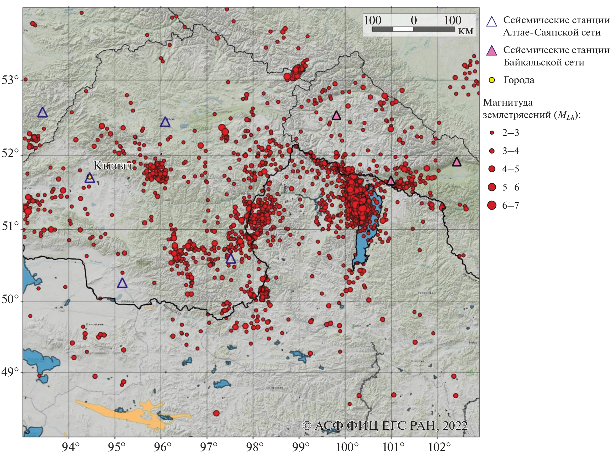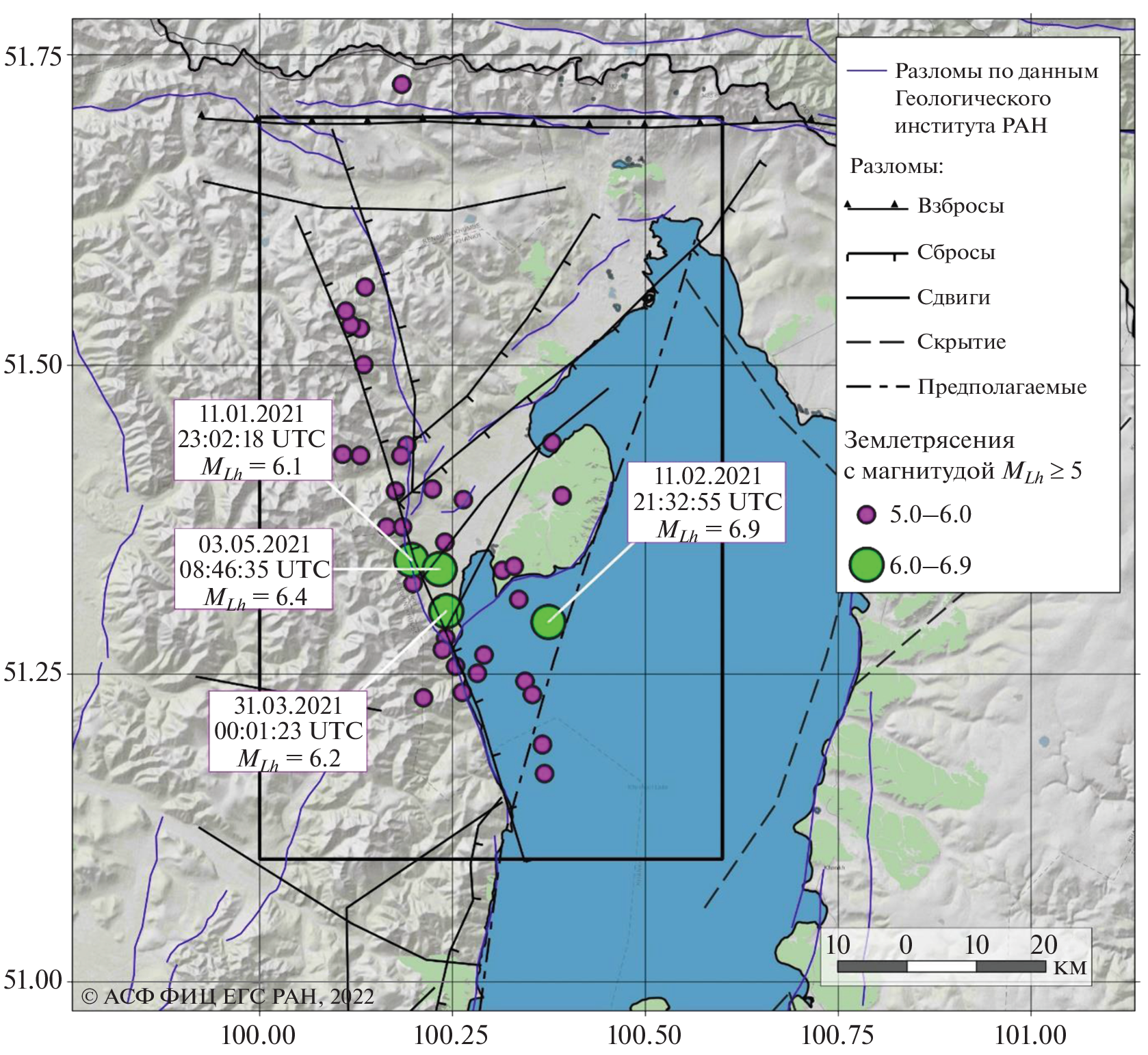 —The paper presents the studies of the Khuvsgul earthquake on January 11, 2021 at 21:32 UTC (January 12, 2021 at 05:32 local time), MW = 6.7, ML = 6.9, and the seismicity structure in the aftershock period for the Altai-Sayan mountain region and the Baikal rift zone, where the epicenter of this earthquake was located. Two faults are seismically activated, diverging from the southern end of the aftershock area at an acute angle: one in the northeast and one in the northwest direction, as well as transverse faults between them. According to the epicenter position and studies of the source area by other authors, the main event corresponds to the northeastern fault, and large aftershocks occurred at the junction of the northwestern fault with transverse faults feathering from the east. The main event was immediately followed by a series of large aftershocks, the strongest of which occurred on March 31, 2021 with ML = 6.2 and on May 3, 2021 with ML = 6.4. Spatial changes in the seismic regime of the aftershock region led to the predominant activity of its southern end. The junction area of the collisional structures of the Altai-Sayan folded zone and the rift structures of the Baikal depressions system is distinguished in seismicity as a block structure with increased seismicity near the block boundaries. First of all, these are the Tuva-Mongolian block and the eastern part of the Sayano-Tuva block. After the Khuvsgul earthquake of 2021, a block structure with the activation of the epicentral zones of the 1991 Busingol earthquake, the 2011–2012 Tuva earthquakes, and other structures seismically active until 2021 has increased seismic activity. It is proved that the 2014 Khubsgul earthquake occurred under the basin of the same name and is associated with other faults than the 2021 earthquake and is not a direct precursor of the 2021–2022 activation.