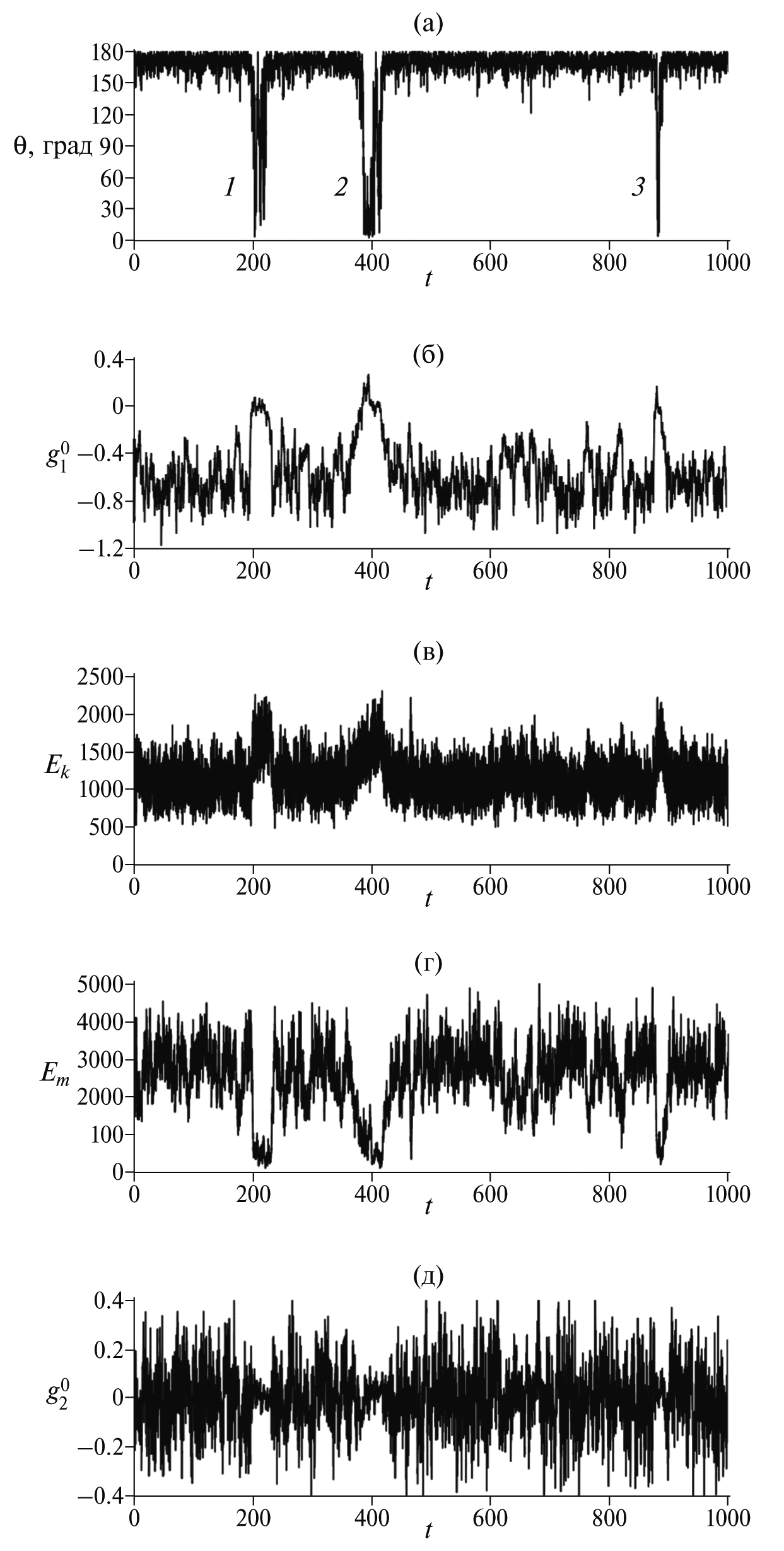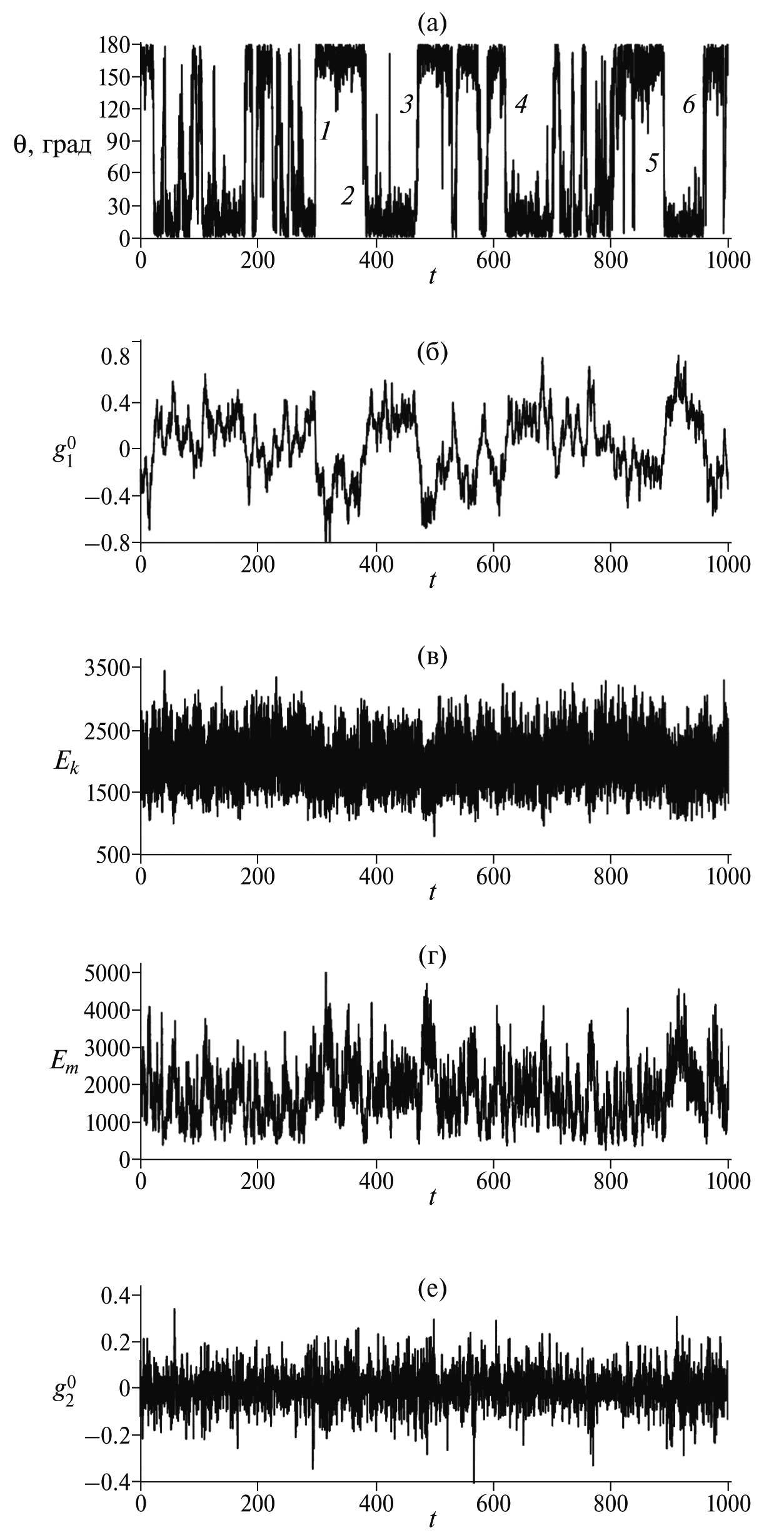 Случай с более развитой конвекцией представлен на рис. 2. Наблюдается большее число смен полярности, рис. 2а, соответствующих как экскурсам магнитного поля, во время которых магнитный диполь лишь ненадолго находился в экваториальной зоне, так и полноценным инверсиям, когда амплитуда успевала восстановиться после смены полярности. Наиболее яркие инверсии отмечены цифрами. Так же, как и для экскурсов, наблюдается антикорреляция между поведением магнитной и кинетической энергий, но в меньшей степени. Если ранее поведение Em и были близки, то теперь Em стало более зашумленным, в силу наличия большего количества возбужденных мод. Перед инверсиями наблюдается увеличение амплитуды магнитного диполя. В свою очередь, небольшие скачки приводят к колебаниям либо вблизи географических полюсов, либо к экскурсам.