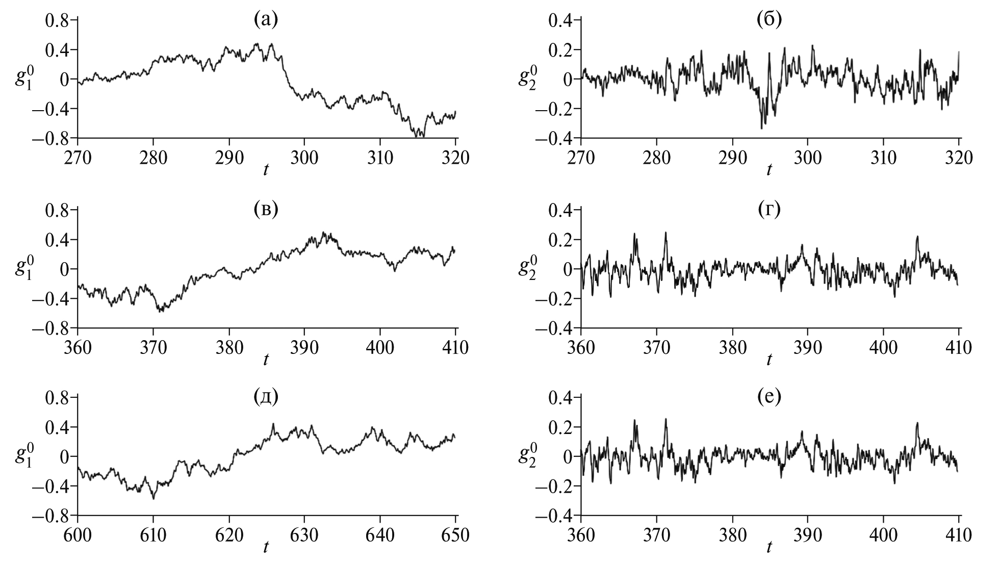 Рис. 3. Зависимость от времени t осевого диполя (а), (в), (д) и квадруполя (б), (г), (е) во время инверсий (1, 2, 3) на рис. 2 в увеличенном масштабе соответственно.