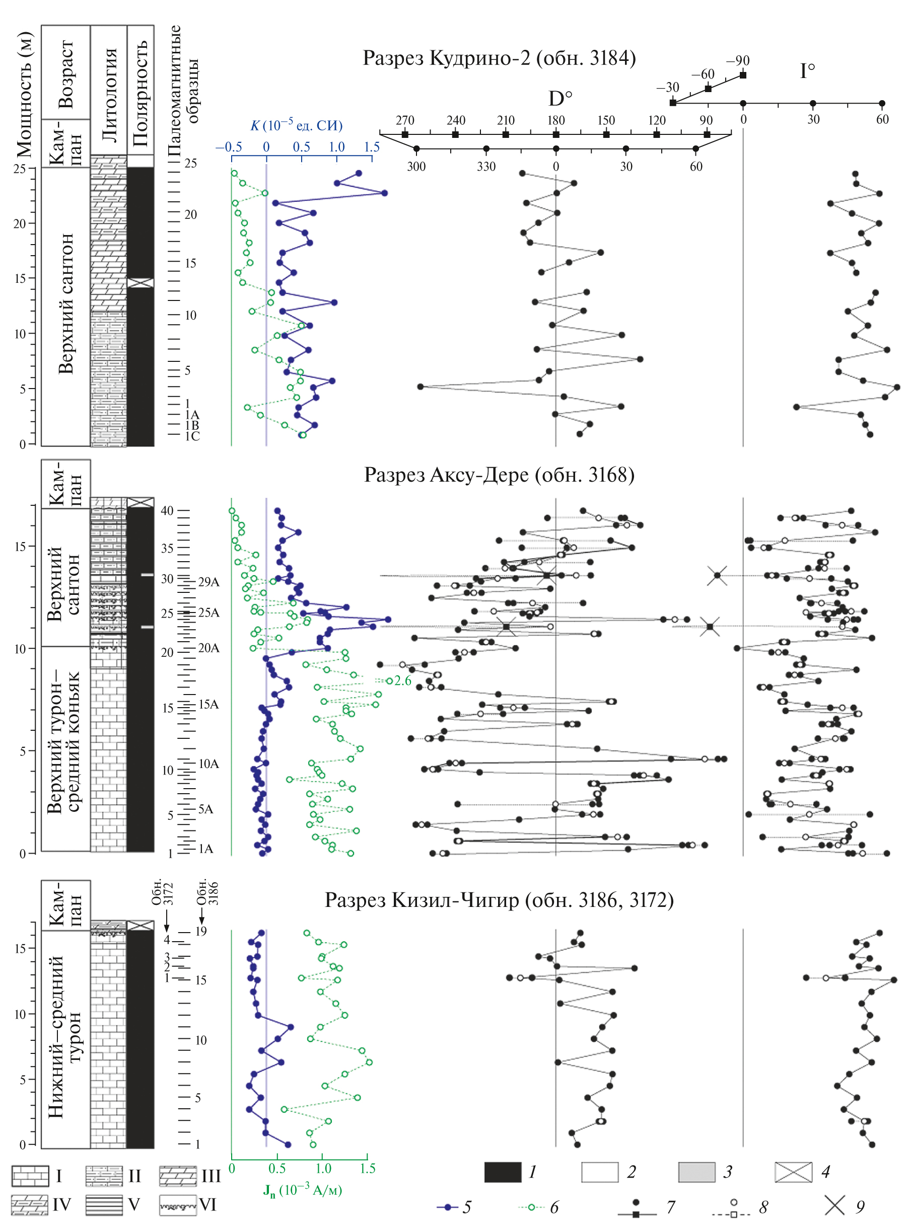 Рис. 3. Магнитостратиграфические характеристики турона–сантона разрезов Кизил-Чигир, Аксу-Дере и Кудрино-2. Условные обозначения. Литология: I – известняки, II – алевритистые известняки, III – мергели, IV – сильноглинистые мергели, V – глины, VI – поверхности хардграундов. Полярность: 1 – прямая; 2 – обратная; 3 – аномальная; 4 – отсутствие данных о полярности. Графики по разрезам: 5 – магнитной восприимчивости (K); 6 – естественной остаточной намагниченности (Jn); 7 – палеомагнитного склонения (D) и наклонения (I); 8 – средние значения палеомагнитных векторов по образцам с одного уровня (кружки и квадратики соответствуют диапазонам 285° < D < 360°, 0° ≤ D < 75°, (–30°) < I < 90° и 75° ≤ D ≤ 285°, (–90°) < I < (–30)° соответственно); 9 – палеомагнитные направления, исключенные из статистического анализа.