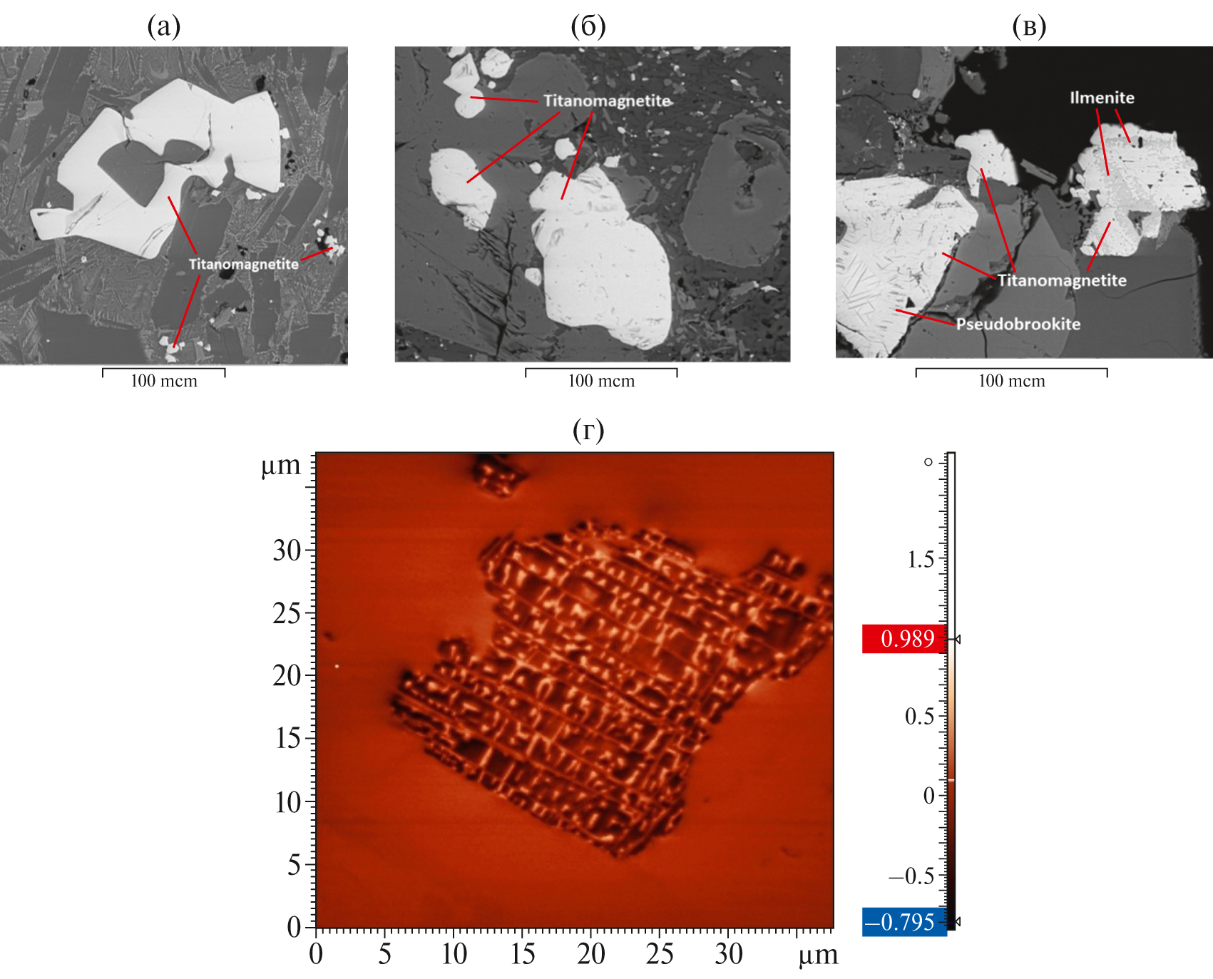 Информация о минеральном составе, структуре и размерах ферримагнитных зерен – носителей остаточной намагниченности – получена путем проведения электронно-зондовых исследований аншлифов на сканирующем микроскопе Tescan Vega II XMU (s.r.o. Tescan, г. Брно, Чехия) сотрудником Института экспериментальной минералогии РАН А.Н. Некрасовым. Магнитная доменная структура изучена с помощью магнитосилового микроскопа NFM Solver-Pro (NT MDT Зеленоград).