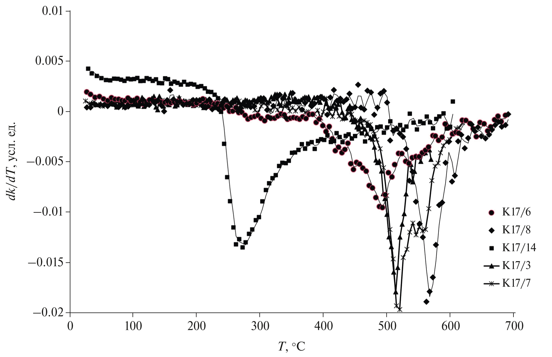 Рис. 4. Зависимости производной магнитной восприимчивости от температуры образцов лав ТТИ-50 (обр. К17/14) и вулкана Авачинский (обр. К17/6 – поток Л1; обр. К17/3 и К17/7 – поток Л2, обр. К17/8 – поток Л3). Положение минимумов на кривых показывает температуру Кюри.