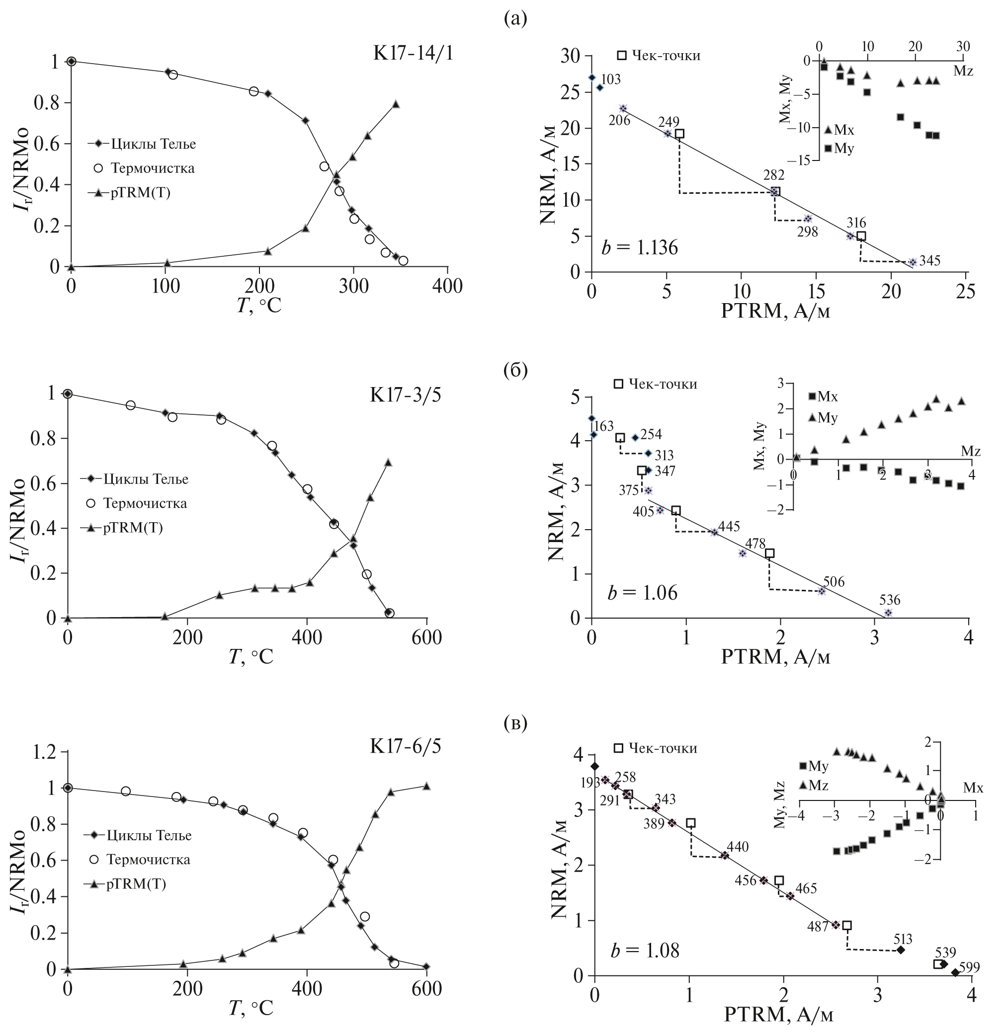 Для контроля минералогических изменений ферримагнетика в циклах Телье выполнялась процедура check-points pTRM [Prevot et al., 1985]. Также сравнивалась интенсивность терморазмагничивания NRM в циклах Телье и при термочистке. Надежность определений палеонапряженности оценивалась по параметру качества q [Coe et al., 1978], а также параметру DRAT [Selkin, Tauxe, 2000].