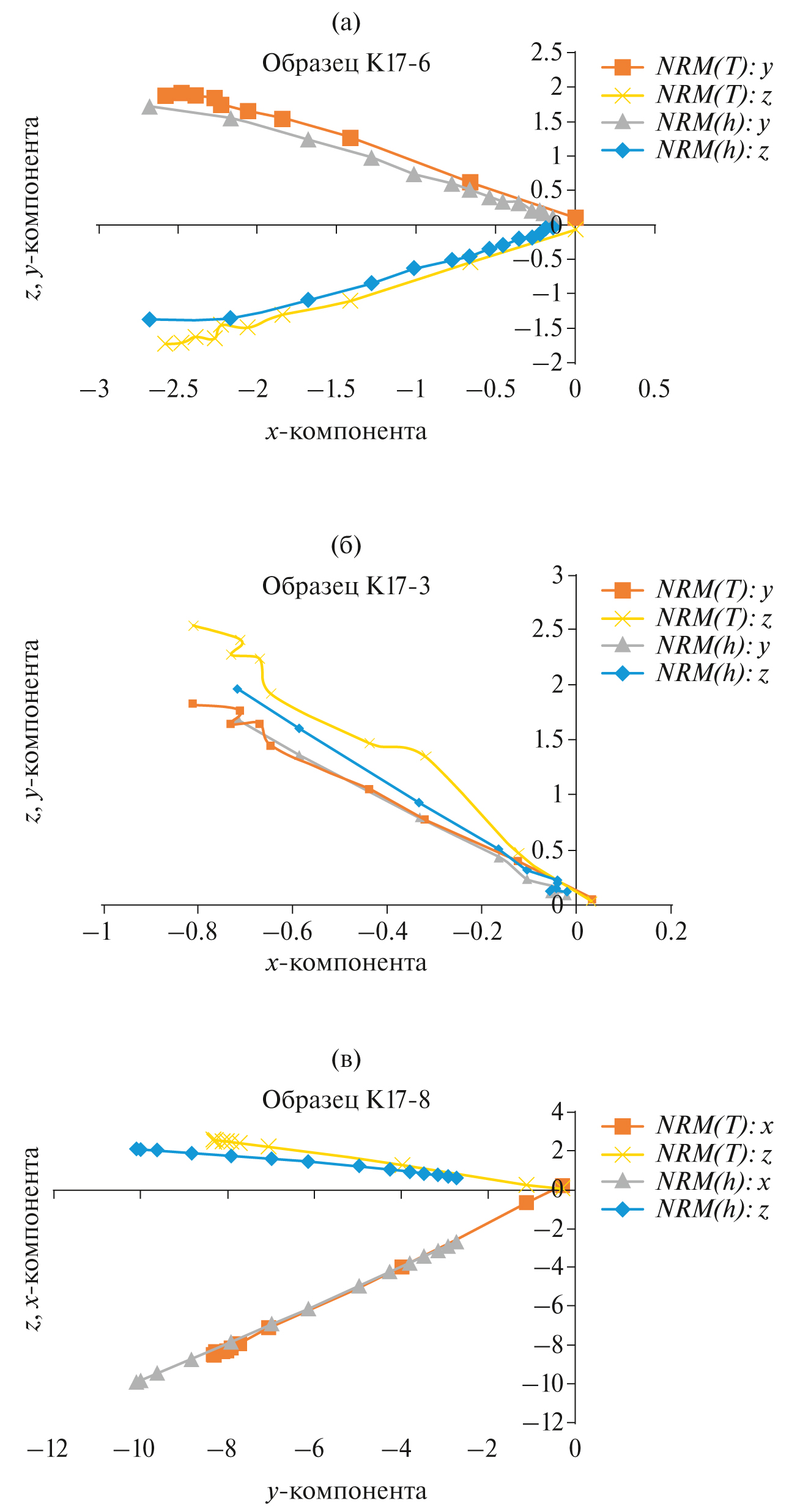 Размагничивание переменным магнитным полем и термочистка показали (рис. 7), что NRM большинства образцов однокомпонентна, в некоторых случаях небольшой вклад вносит низкокоэрцитивная компонента, вероятно, вязкой природы (например, рис. 7а).
