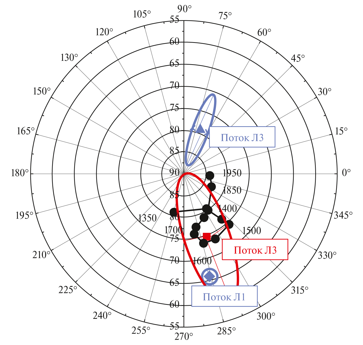 В табл. 5 приведены координаты виртуального геомагнитного полюса (Plat, Plong), рассчитанные по Jдр и Dдр для 3-х опробованных потоков, на рис. 9 – положения виртуального геомагнитного полюса (ВГП) в стереографической проекции. Видно, что во время формирования потоков Л1 и Л2 ВГП находился в 4-м квадранте, во время формирования потока Л3 – в 1-м квадранте.