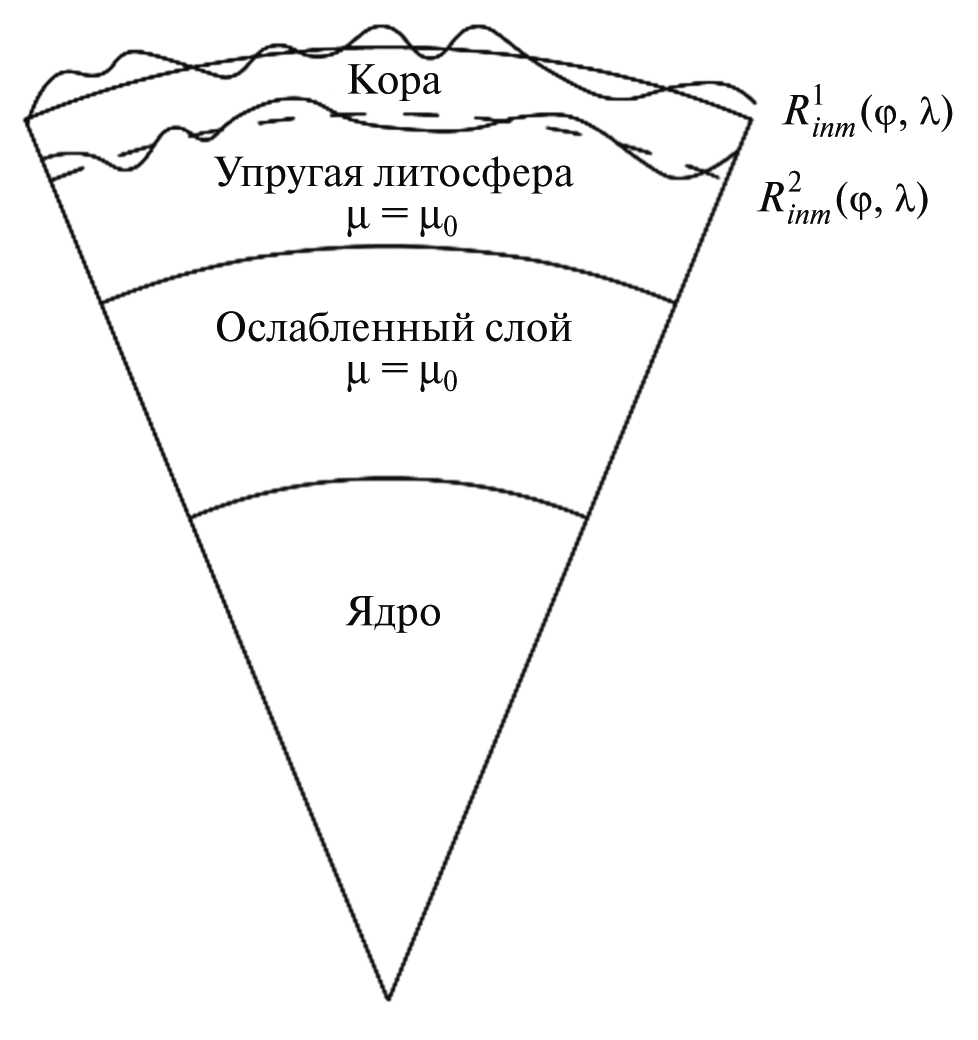 Мы предполагаем, что имеется два уровня залегания нагрузок (аномальных масс) – на поверхности r = R, и границе кора–мантия r = R1 = R – l, где l – толщина коры (двухуровневая модель компенсации) (рис. 1). Амплитуды нагрузок и (где ϕ – широта и λ – долгота) выбираются таким образом, чтобы удовлетворить данным топографии и гравитационного поля планеты, взятым по отношению к равновесной поверхности планеты.