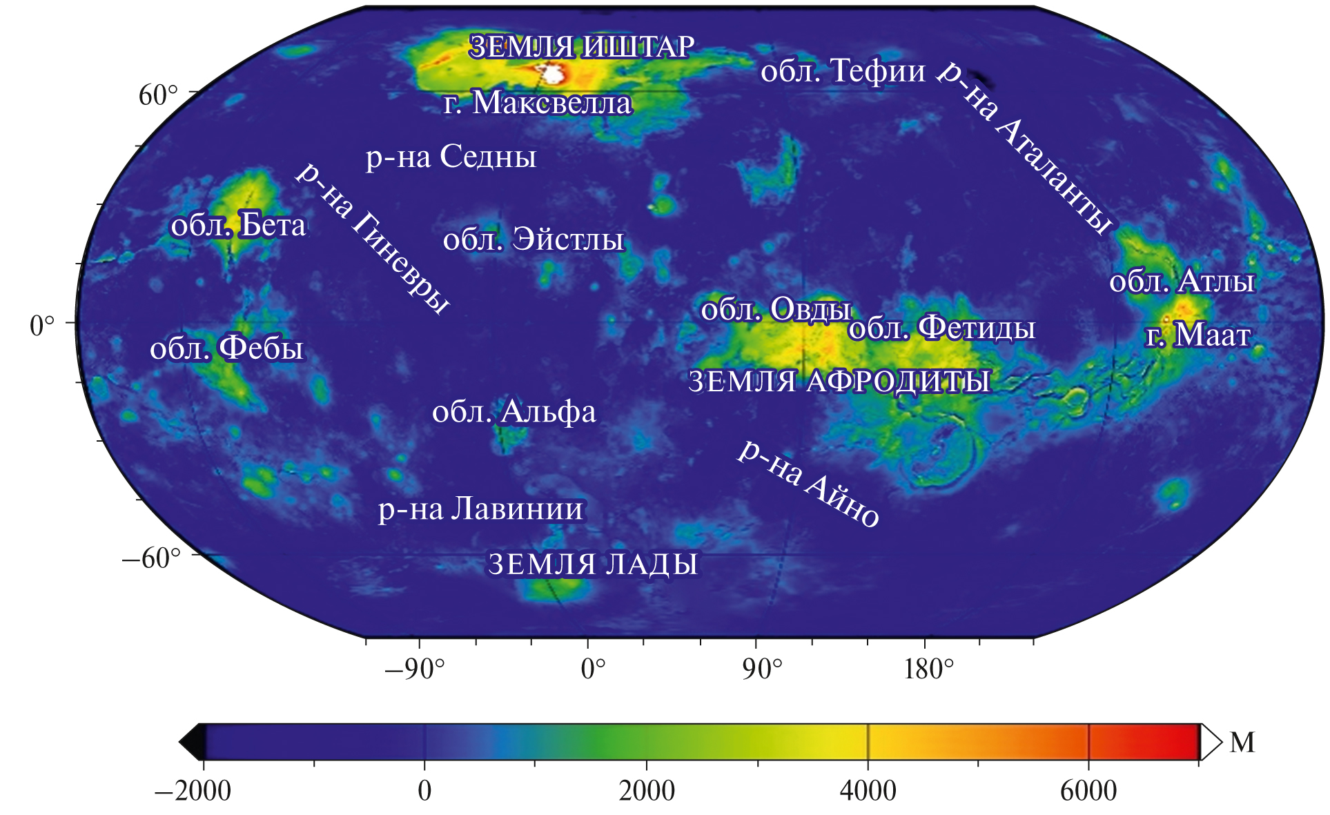 В настоящее время для Венеры разложение данных гравитационного поля по полиномам Лежандра известно до 180-й степени и порядка (модель SHGJ180u) [Konopliv et al., 1999], данные о топографии до 360-й степени и порядка (модель SHTJV360u) [Rappaport et al., 1999]. Эти модели, представленные в виде рядов полностью нормализованных коэффициентов, можно найти на сайте Системы Планетных данных (http://pds-geosciences.wustl.edu). В данной работе используются коэффициенты этих моделей, взятые до 70-й степени и порядка, так как корреляция между гравитационным полем и топографией убывает для более высоких гармоник [Менщикова и др., 2021]. Топографическая карта Венеры с обозначением структур представлена на рис. 3.