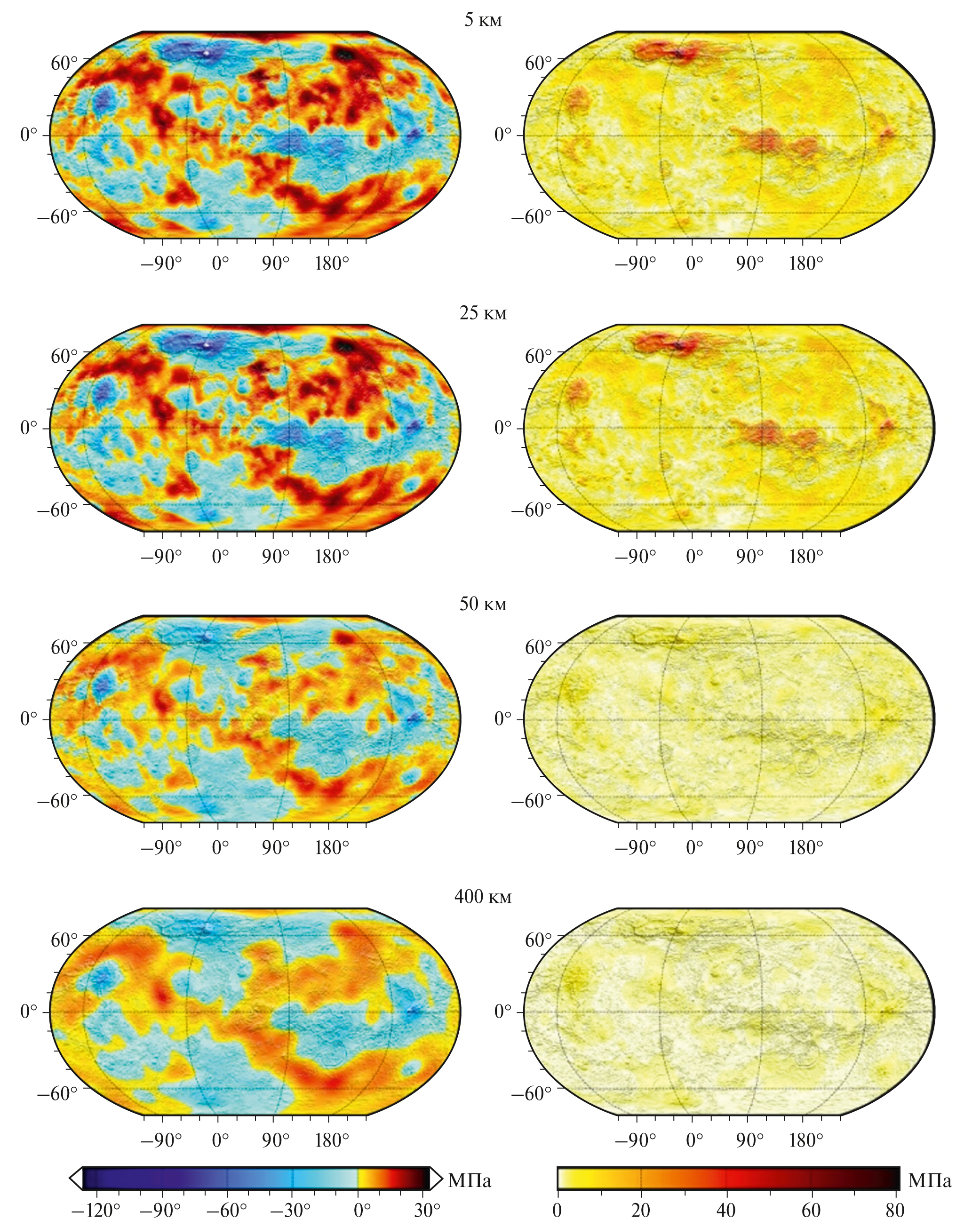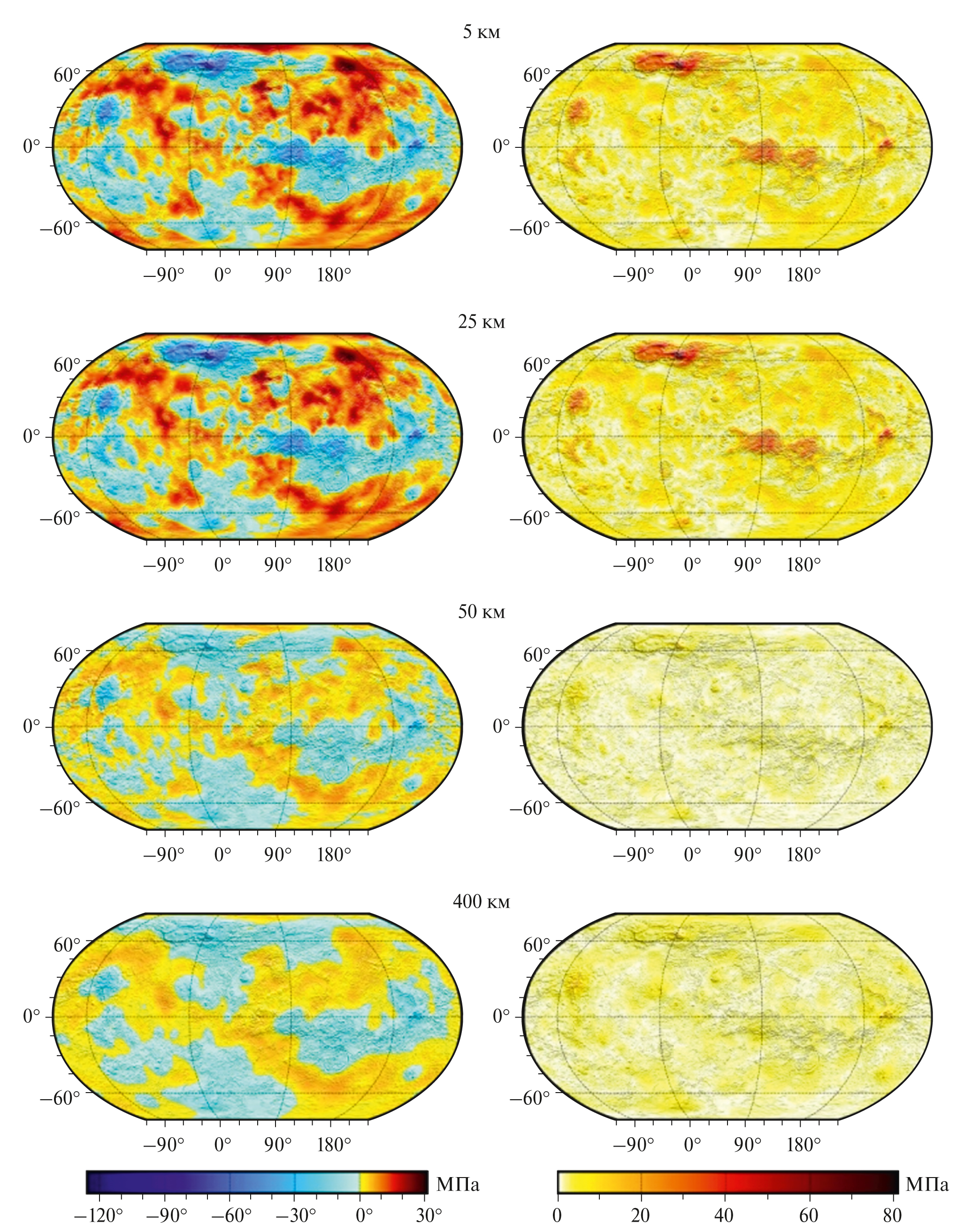 На рис. 4 показаны карты напряжений растяжения–сжатия и сдвига в коре и мантии для модели с толщиной коры 30 км для чисто упругой модели. Как и ожидалось, на поверхности планеты и в коре наибольшие касательные напряжения проявляются в районе горы Максвелла на Земле Иштар (Ishtar Terra). Под горами Максвелла (Maxwell Montes) напряжения сдвига в коре достигают 80 МПа, значения сжатия достигают значений 125–150 МПа, в зависимости от модели: 125 МПа для чисто упругой модели, и 150 МПа для модели с литосферой 100 км. Напряжения растяжения вокруг этой области составляют около 20 МПа. Наибольшие напряжения растяжения приходятся на области под такими структурами как равнина Лавинии (Lavinia Planitia), равнина Седны (Sedna Planitia), равнина Айно (Aino Planitia). Уровень напряжений в литосфере зависит от выбора модели. Напряжения сжатия–растяжения и сдвига для модели с литосферой 300 км (рис. 5) выше, чем для однородной по упругим свойствам модели (рис. 4). Чем меньше толщина литосферы, тем выше в ней напряжения. В области равнины Айно напряжения растяжения составляют 23 МПа для моделей с литосферой 100 км, и 20 МПа для толщины литосферы 500 км. Нет существенной разницы в характере напряжений, полученных для моделей с толщиной коры 30 и 70 км.
