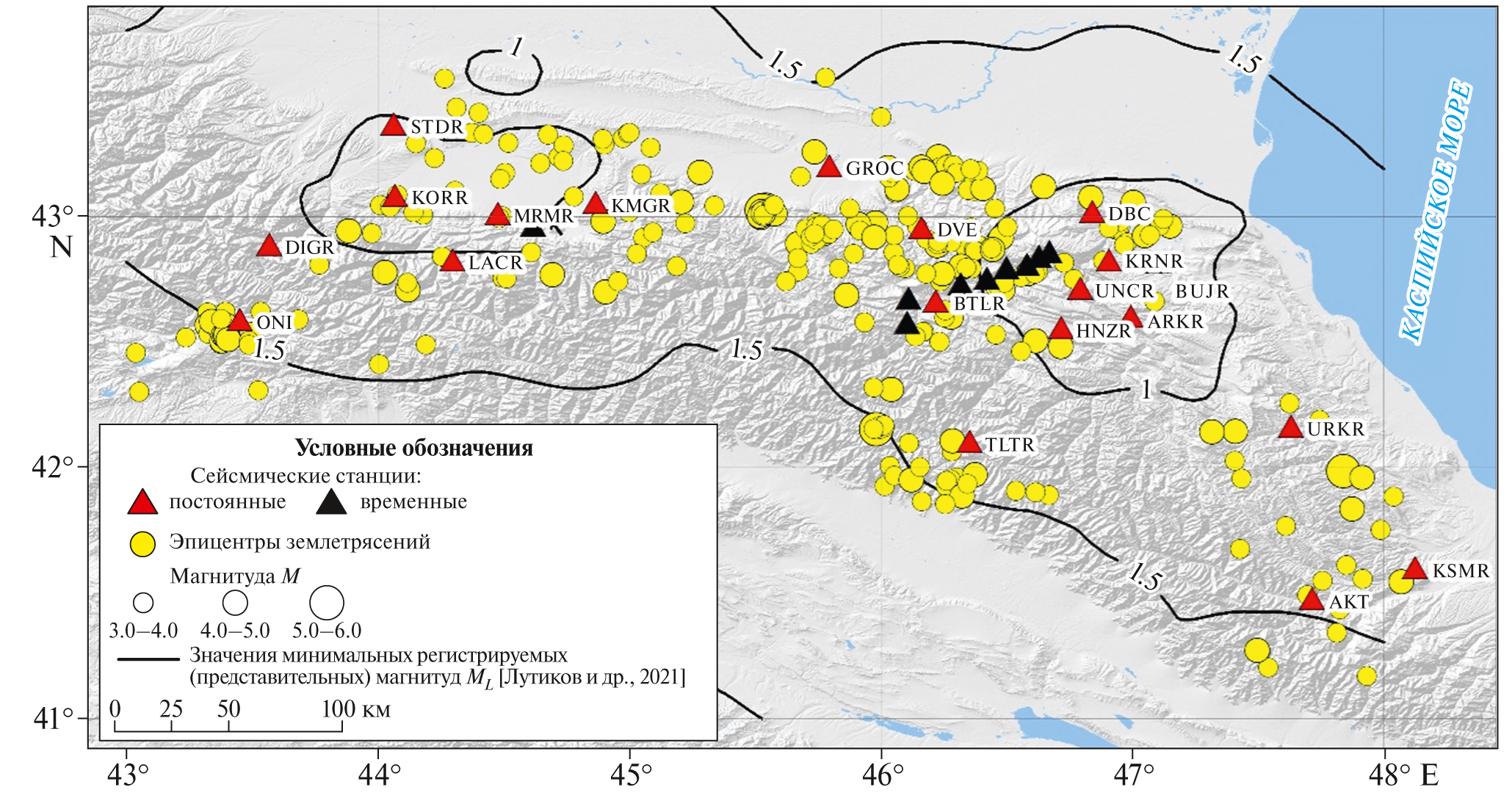 Сейсмостанции ФИЦ ЕГС РАН восточной зоны Северного Кавказа по большей части оснащены современными короткопериодными и широкополосными сейсмометрами, обеспечивающими уверенную регистрацию землетрясений с ML ≥ 1.5 на исследуемой территории, а в отдельных ее областях – с ML ≥ 1.0 [Лутиков и др., 2021]. Таким образом, все анализируемые нами сейсмические события имели представительный уровень магнитуд, а их основные параметры были определены по данным региональных сетей сейсмологических наблюдений Северо-Осетинского (NOGSR) и Дагестанского (DAGSR) филиалов ФИЦ ЕГС РАН, а также Центрального отделения (OBGSR) в Обнинске [Габсатарова и др., 2022].