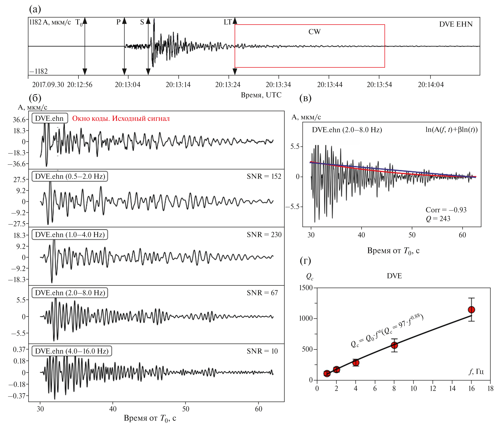 Рис. 3. Процесс обработки данных модулем “Coda Q” программного комплекса SEISAN для оценки частотно-зависимых значений добротности Qc: (а) – исходная сейсмограмма в пункте наблюдения Дышне-Ведино (DVE) с отметками времен вступления P- и S-волн, времени в очаге (T0), времени начала окна коды (LT), а также длительности окна коды (CW); (б) – окно коды (CW) исходного сигнала и результатов полосовой фильтрации; (в) – огибающая кода-волн в полосе частот 2.0–8.0 Гц, Corr = –0.93 – коэффициент корреляции с линией аппроксимации; (г) – среднее значение Qc на каждой центральной частоте со стандартными отклонениями и аппроксимирующей степенной функцией.