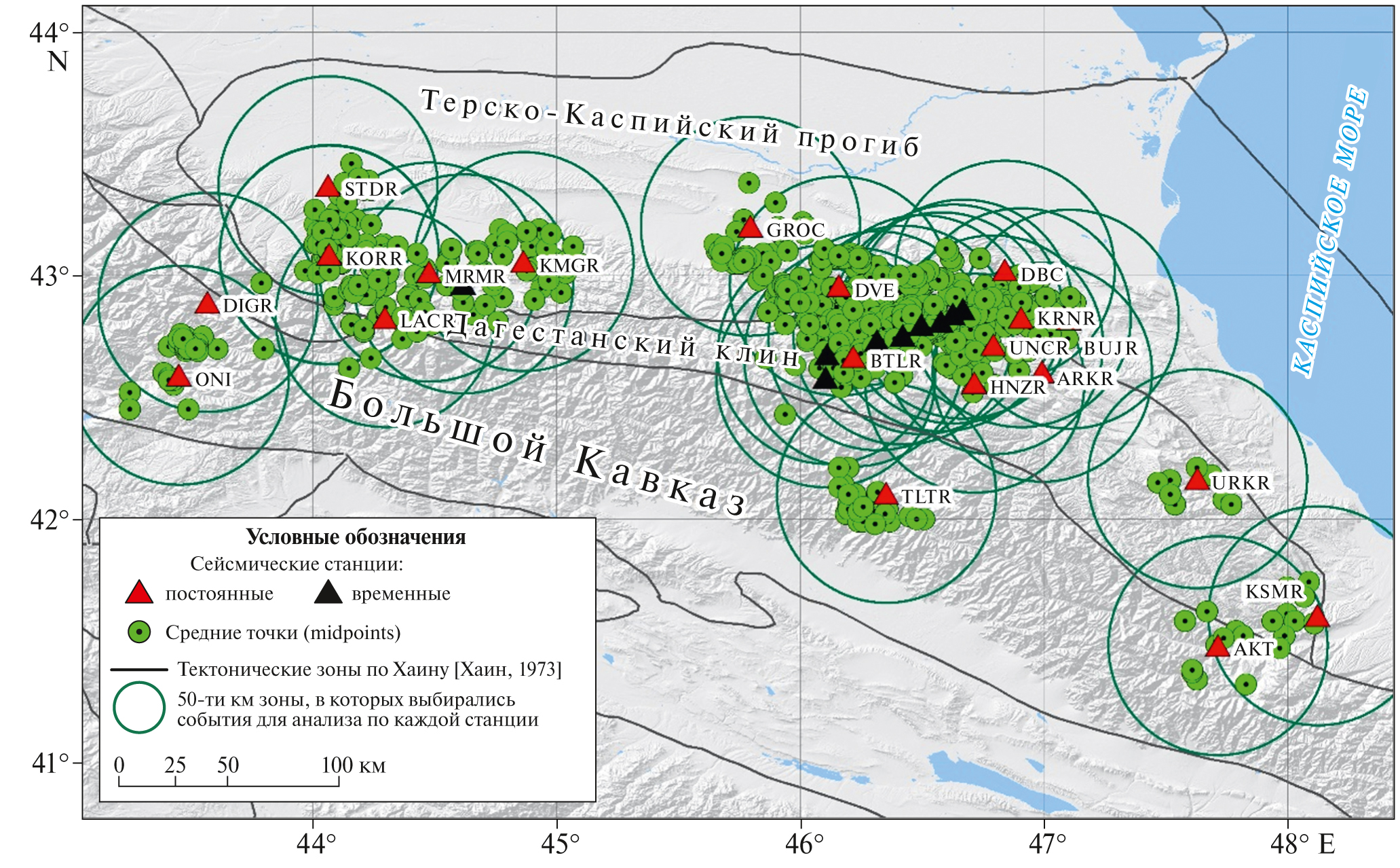 На данном участке Альпийско-Гималайского подвижного пояса геодинамическая обстановка в значительной степени контролируется условиями коллизии Евразийской и Аравийской литосферных плит, ответственными за всю совокупность разномасштабных сейсмотектонических процессов в неоднородной геологической среде [Philip et al., 1989; Ershov et al., 2003; Koulakov et al., 2012; Собисевич и др., 2015; Milyukov et al., 2015; Kaban et al., 2018; Лукк, Шевченко, 2019; Ismail-Zadeh et al., 2020; Трифонов и др., 2020; Rogozhin et al., 2020; Магомедов, Мамаев, 2022]. Основные сейсмогенерирующие структуры региона представлены крупнейшими шовными зонами и узлами их пересечения, определяемыми системами активных разломов общекавказского, поперечного (северо-восточного) и диагонального (северо-западного) простирания [Несмеянов, 2012; Рогожин и др., 2014; Магомедов, Мамаев, 2022].