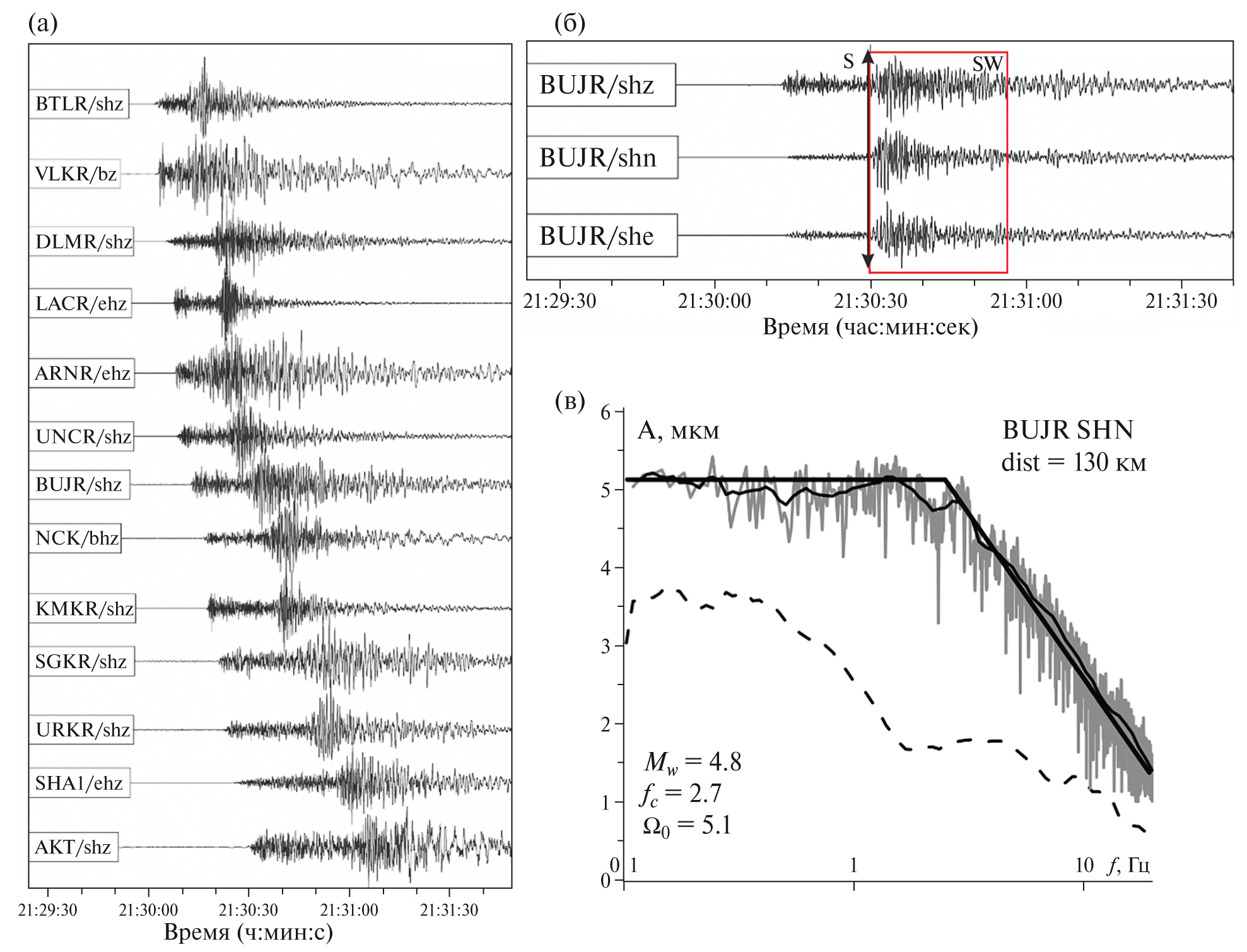 Следуя работе [Havskov et al., 2016] для поверхностных волн, было установлено значение коэффициента геометрического расхождения β = 0.5, а для объемных волн β = 1.0, согласно работам [Ibanez et al., 1990; Dasovic et al., 2013; Bora et al., 2017; Giampiccolo et al., 2018]. Также и длительность окна коды (параметр CW на рис. 3а) была выбрана равной 30 с. Минимальное время начала окна коды (параметр LT на рис. 3а) ограничивалось двойным временем пробега S-волн (в противном случае сейсмическое событие не принималось в расчет), что позволяло усреднять значения, полученные на различных сейсмостанциях. Таким образом, начало расчетного интервала относительно времени в очаге (Т0) для всех анализируемых событий составляло 30 с. Отметим, что на таких расстояниях частотный диапазон поперечных волн составляет 2–5 Гц.