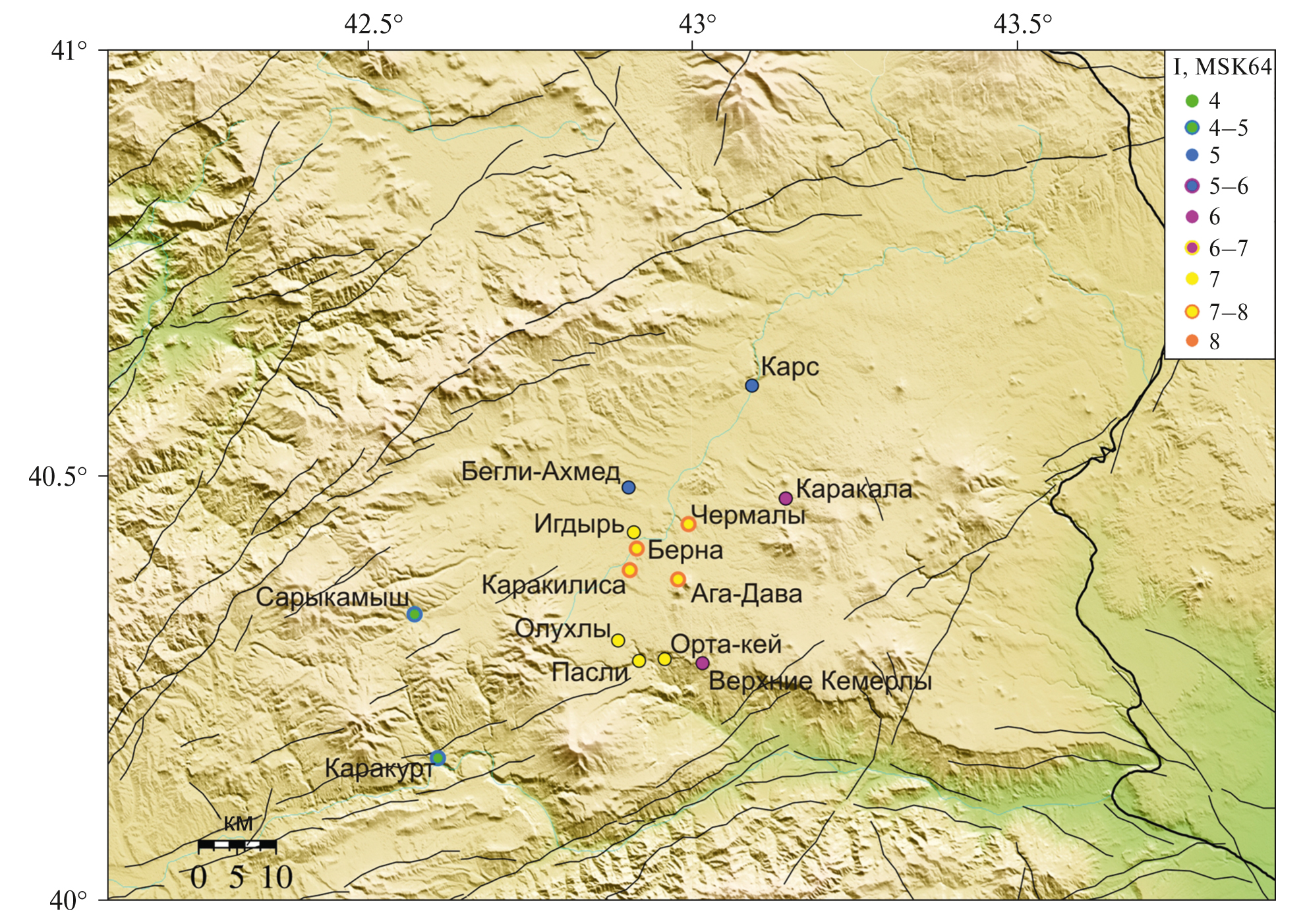 В табл. 2 приведены экспертные оценки интенсивности. При их назначении учитывались не только описания макросейсмического эффекта, но и сведения о домах. Важной характеристикой общей ситуации, является реакция властей (срочное посещение властями пострадавших селений, выделение палаток и т.п.). Знак вопроса рядом с оценкой интенсивности в селении Верхние Кемерлы связан с тем, что нет описания макросейсмического эффекта непосредственно в деревне. Известно только, что “около селения Верхние-Кемерлы, на спуске с карсского плато в долину Аракса, наблюдаются значительные осовы и оседания почвы”. Знак вопроса стоит также у оценки интенсивности для пункта Каракала. Описание “…замечено было подбрасывание вверх деревяных досок и других предметов” мало пригодно для оценки интенсивности в отсутствии каких-либо сведений о повреждениях или разрушениях, а также реакции людей. В целом сведения Девицкого во многом бесполезны. Судя по детальному описанию погоды, его больше интересовал прогноз землетрясения, чем сами макросейсмические эффекты. Оценки интенсивности сотрясений в пунктах Верхние Камерлы и Каракала не учитывались при определении параметров землетрясения.