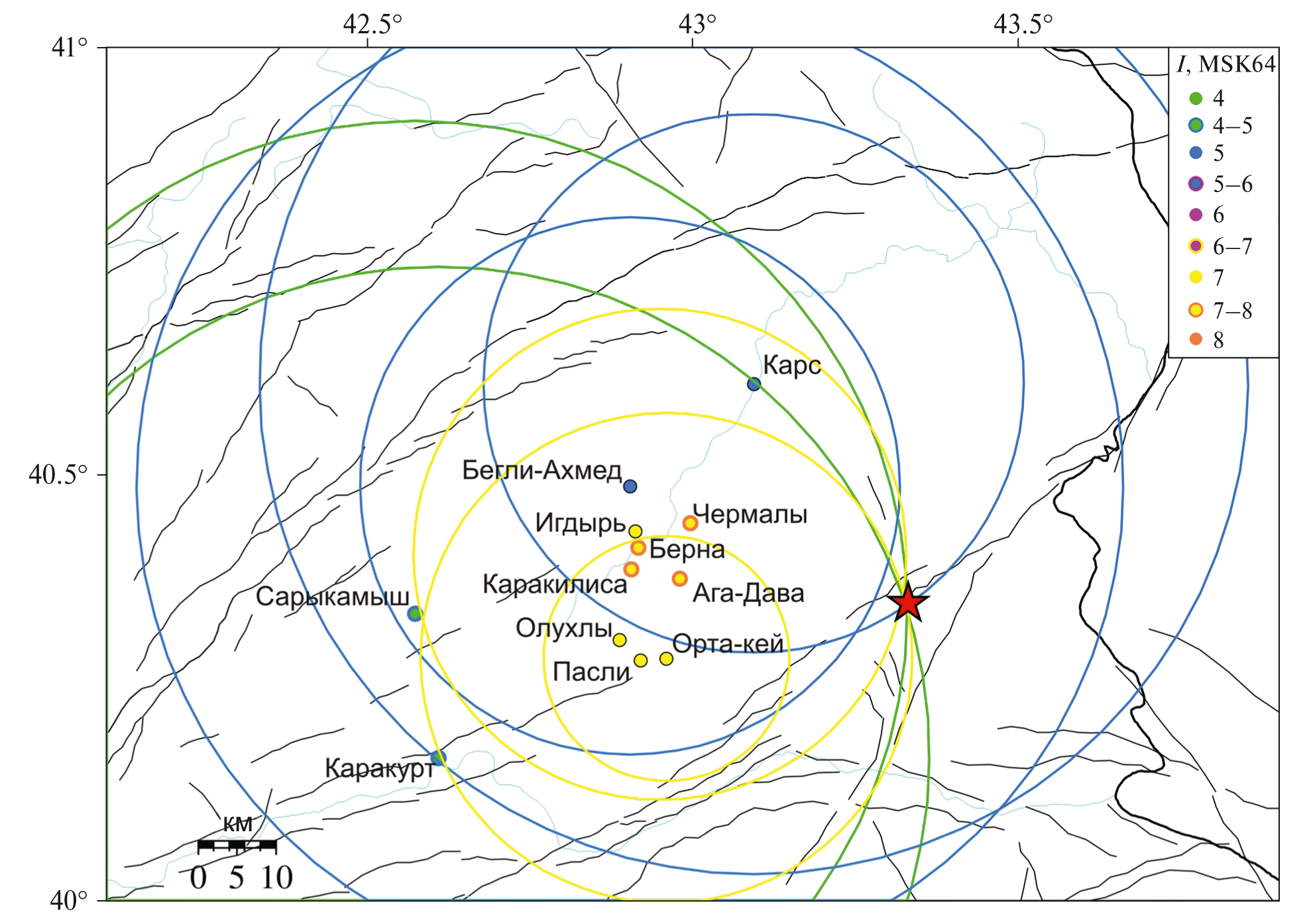 Параметры землетрясения. Для определения параметров землетрясения использован метод колец [Mäntyniemi et al., 2017], основанный на уравнении макросейсмического поля [Шебалин, 1974]. Метод описан также в ряде более поздних публикаций на русском языке [Мокрушина и др., 2020; Татевосян и др., 2023]. Для значений интенсивностей в населенных пунктах, приведенных в табл. 2, были испытаны пробные магнитуды в интервале от 5.5 до 6.5 с шагом 0.1. Для магнитуд 6.0 и выше пересечений всех колец не происходит. На рис. 4 звездочкой показано положение эпицентра для магнитуды 5.9 (глубина гипоцентра 10 км). При этом площадь пересечения колец минимальна, т.е. для этой магнитуды положение эпицентра определяется с минимальным “допуском”, что и послужило основанием для выбора этого решения в качестве окончательного среди всех возможных.