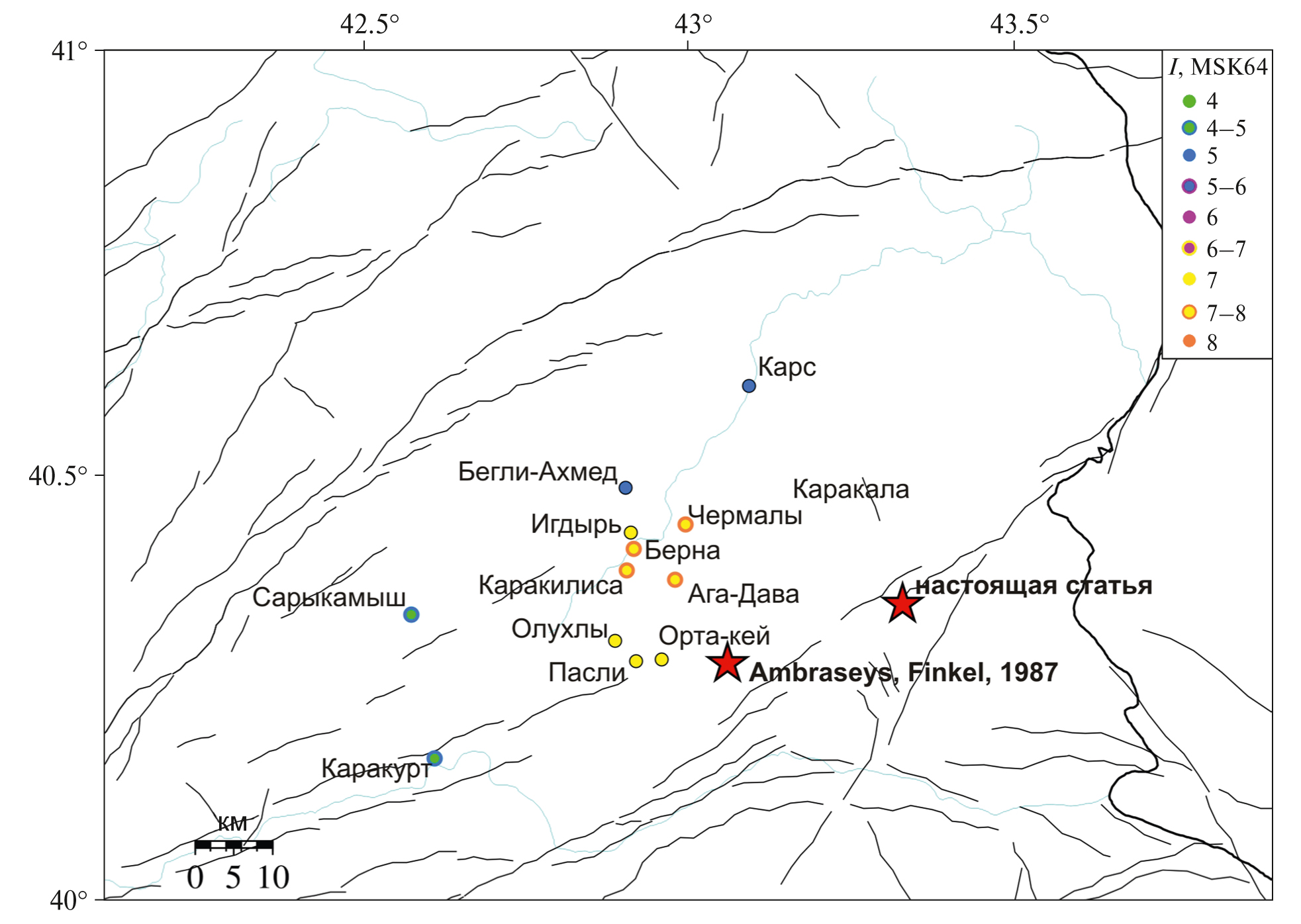 Какие именно газетные сообщения использованы, не уточняется. В списке источников из газет, издававшихся в Российской Империи, есть только газета “Кавказ”. Ссылка на Левицкого ошибочна, в 1901 году такого издания не было; фамилия Девицкого дана с опечаткой. Эпицентральная интенсивность оценена в VIII баллов, приведены радиусы изосейст r3 = 200 км, r4 = 130 км, r6 = 35 км. Эпицентр показан на рис. 5. Поскольку карта изосейст или просто карта “пункты–баллы” не приведена, понять, как получены радиусы трех- и четырех-балльной изосейст, невозможно. Однако можно отметить явное противоречие: если обрисовать эпицентр окружностью радиусом 35 км, пункты со значительными разрушениями и человеческими жертвами, попадут в 6-балльную зону. Заметим, что область Кагызман к югу от Карсской области также принадлежала Российской Империи. Поэтому непонятно, каким образом оценивалась интенсивность сотрясений в эпицентральной области, если авторы не использовали Российские газеты. Расстояние от эпицентра согласно [Ambraseys, Finkel, 1987] до Батума 190 км; сведений об ощутимости там землетрясения нет. Поэтому радиус r3 = 200 км представляется преувеличенным. Что касается оценки магнитуды, отметим точное совпадение определений по инструментальным и макросейсмическим данным.