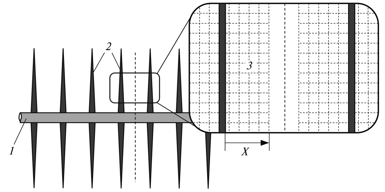Рис. 1. К пояснению постановки задачи: 1 – скважина, 2 – магистральные трещины, 3 – стимулированный объем, содержащий систему вторичных трещин; X – протяженность стимулированного объема по нормали к плоскости трещины гидроразыва.