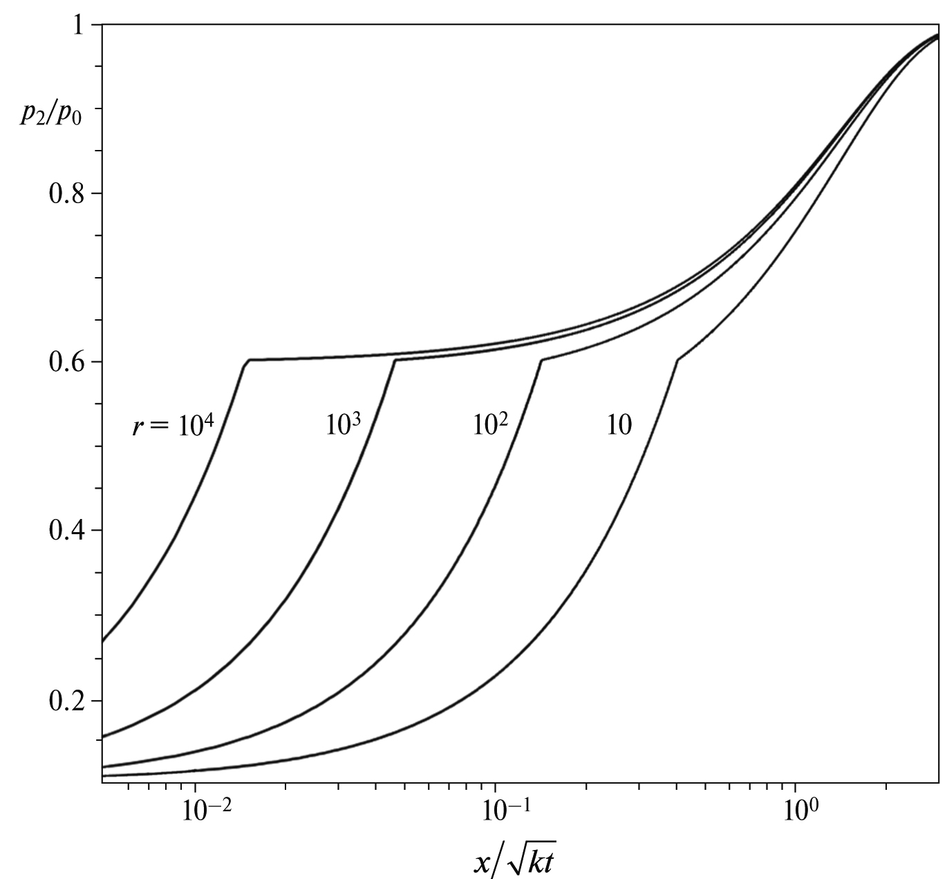Рис. 2. Асимптотическое при t → ∞ решение задачи о распространении волны разрушения в полупространстве x > 0, вызванной понижением порового давления в подсистеме трещин на его границе при x = 0. Показано отношение давлений p2/p0 как функции автомодельной переменной для четырех случаев, отличающихся значением r.
