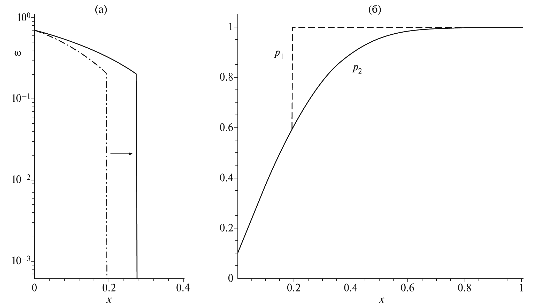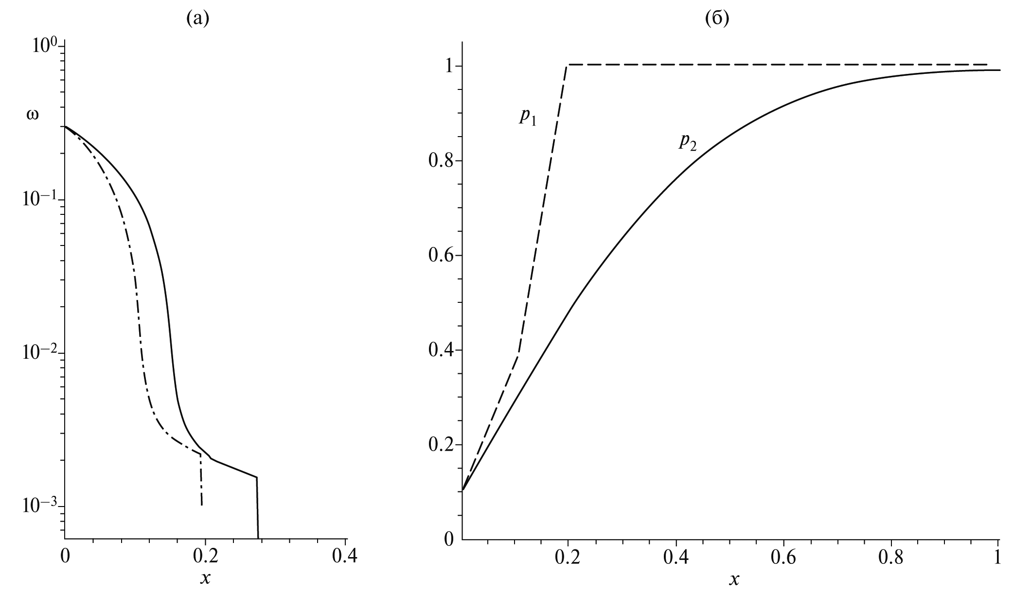 Рис. 3. (a) – профиль поврежденности при (штрихпунктирная линия), при (сплошная линия); (б) – профили давлений при Параметры