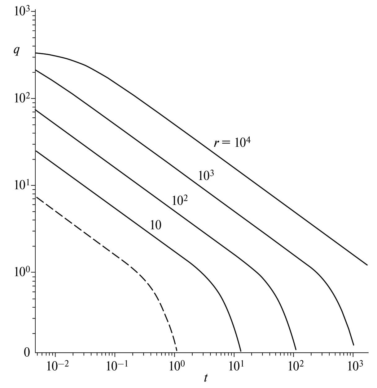 Зависимость дебита от времени в широком диапазоне параметра r показана на рис. 4. Пунктирная линия соответствует решению без накопления повреждений, то есть без обмена массой между подсистемами. Из рисунка следует, что все решения имеют промежуточную асимптотику Начальная стадия при больших r характеризуется практически постоянным во времени расходом. На больших временах видно снижение дебита из-за влияния ограниченной протяженности зоны проводящих трещин. При выбранном значении обменного коэффициента при появлении поврежденности выравнивание давлений происходит достаточно быстро, таким образом, в рассматриваемом случае дебит не чувствителен к величине и знаку параметра