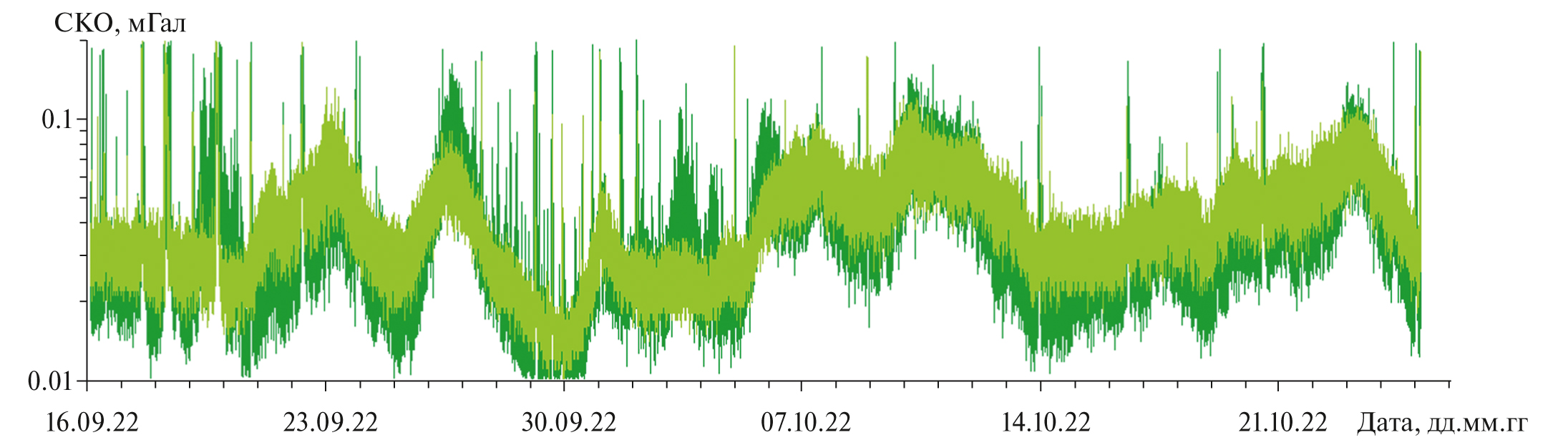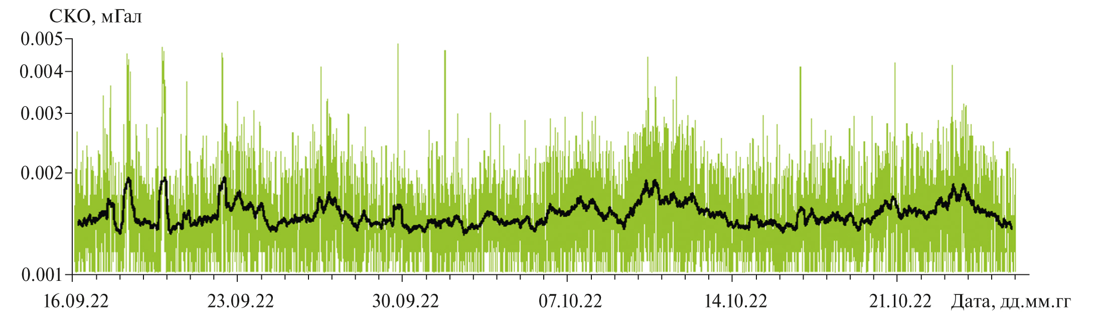 В современных гравиметрах предусмотрена система сейсмической фильтрации, но, несмотря на это, наблюдается остаточная зашумленность, вызванная тем, что в гравиметре микросейсмические воздействия устраняются простым осреднением [Boddice et al., 2018]. Для оценки зашумленности гравиметрического ряда было рассчитано СКО по 5-минутным отрезкам гравиметрических данных, а затем проведено осреднение скользящим 3-х часовым окном (рис. 2).