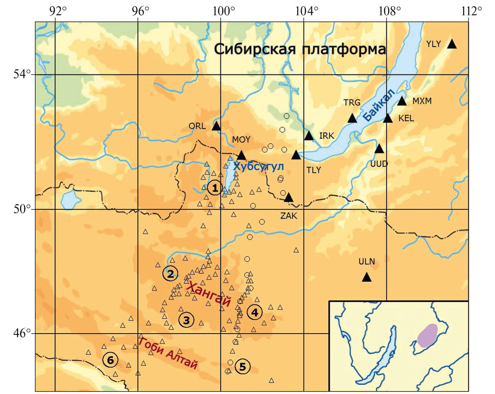 Рассматривается глубинная структура части Восточной Азии, включающей южную окраину Сибирского кратона, Байкальскую рифтовую зону, юго-западное продолжение БРЗ (рифтовая система Тункинской впадины и озера Хубсугул) и западное Монгольское плато (Хангай и Гоби–Алтай). Район нашего исследования (рис. 1) относят к Центрально-Азиатскому орогенному поясу и выделяют в нем несколько мантийных блоков, различающихся тектоникой, геофизическими характеристиками и возрастом (от докембрия до триаса включительно). Данные геологических исследований дополняются анализом сейсмичности и вулканизма. Районы распространения кайнозойского вулканизма в БРЗ находится в юго-западной части и на северо-востоке.