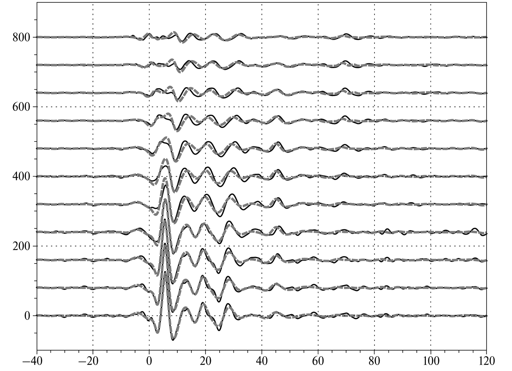 Теоретические сейсмограммы объемных волн рассчитываются методом Томсона–Хаскелла [Haskell, 1962] с уплощением (см. работу [Biswas, 1972]). Синтетические суммарные приемные функции волн Ps рассчитываются при помощи той же процедуры суммирования, что и при обработке наблюдений. Для волн Ps суммируются синтетические сейсмограммы, рассчитанные для набора из 8 лучевых параметров, в диапазоне от 4.5 до 8.0 с/град. Для Sp используются 8 лучевых параметров от 8.8 до 10.2 с/град. На рис. 4 приведен пример теоретических и наблюденных суммарных приемных функций PRF, рассчитанных путем суммирования 3460 записей для виртуальной станции с центром в точке 48° N, 101° E.