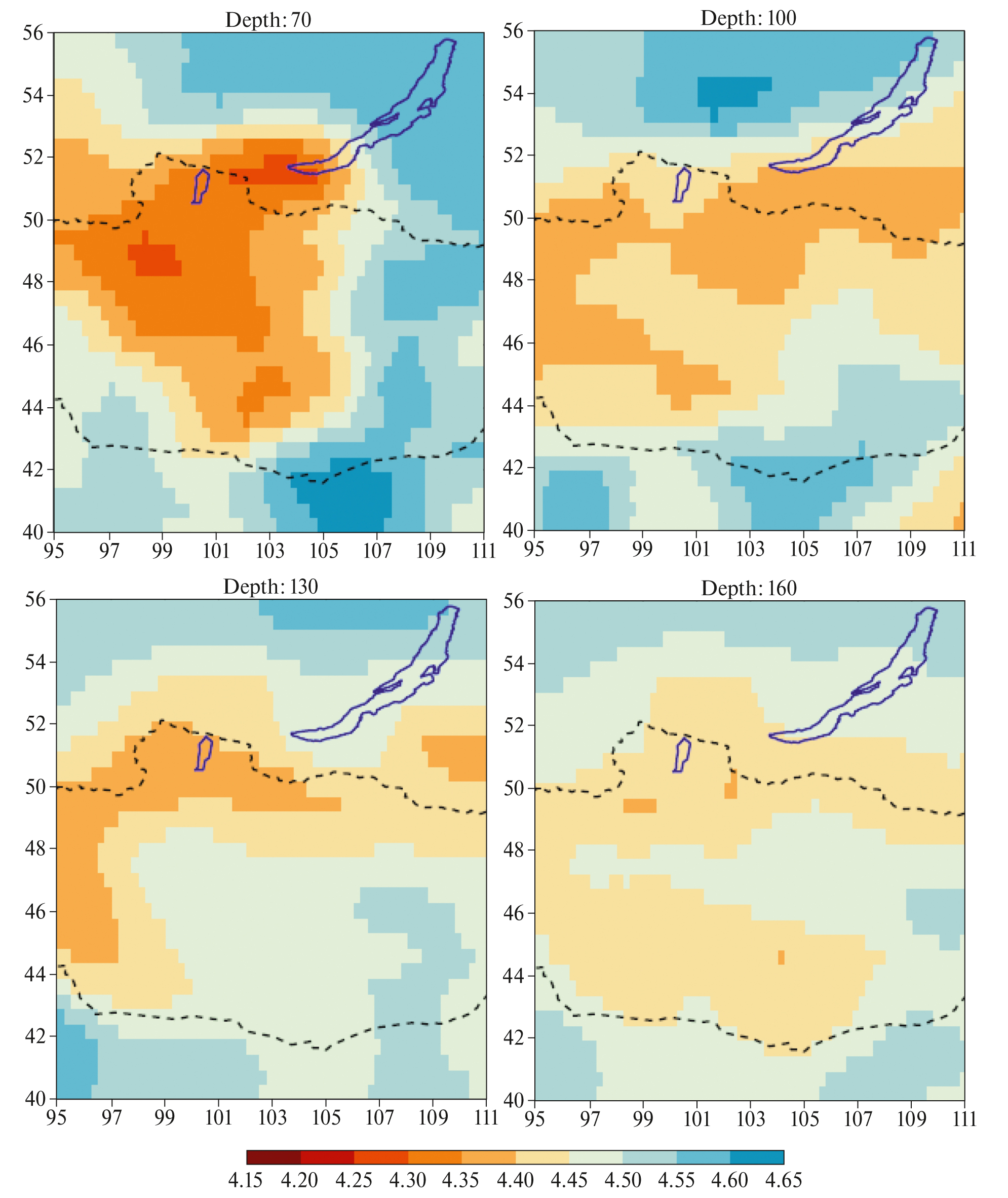 Пространственное распространение этого слоя можно проследить на рис. 6. На карте скоростей на глубине 70 км в северной части астеносферный слой простирается до Главного Саянского разлома до широты 52° и касается южной оконечности озера Байкал. На юге этот слой исчезает около широты 44°. На востоке границей распространения низкоскоростного слоя является меридиан 104° Е, приблизительно соответствующий границе Амурской микроплиты. На глубинах 100–130 км эта низкоскоростная область в западной части образует дугу, а в восточной области образует несколько более широкую полосу между широтами 48 и 52°. На глубинах 130–160 км низкоскоростная область непосредственно под Хангайским поднятием отсутствует. Скорости поперечных волн здесь составляют 4.45–4.50 км/с.