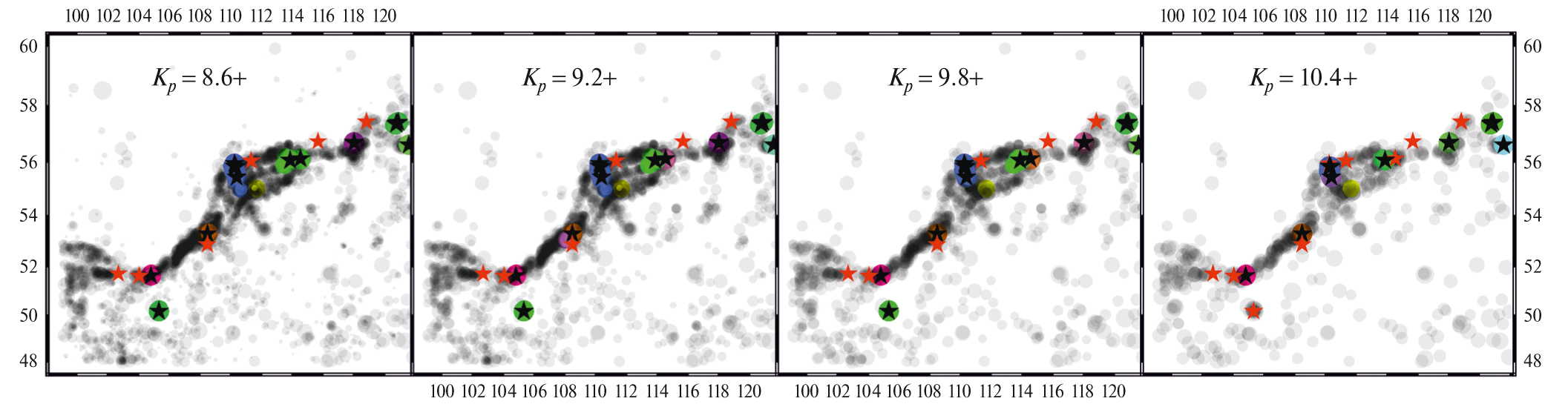 Рис. 4. Пространственное распределение эпицентров землетрясений с KР ≥ 8.6, ≥ 9.2, ≥ 9.8 и ≥ 10.4, объединенных в кластеры алгоритмом DPS: (i) вошедшие в кластеры – цветные символы, (ii) не вошедшие в кластеры – символы серого цвета. Эпицентры землетрясений с KР = 14 и больше, вошедшие в кластеры, показаны черными звездочками; не вошедшие в кластеры – красными звездочками. Примечание: данные с 1989 по 2018 гг. Параметры алгоритма DPS: q = –2, β = –0.5.