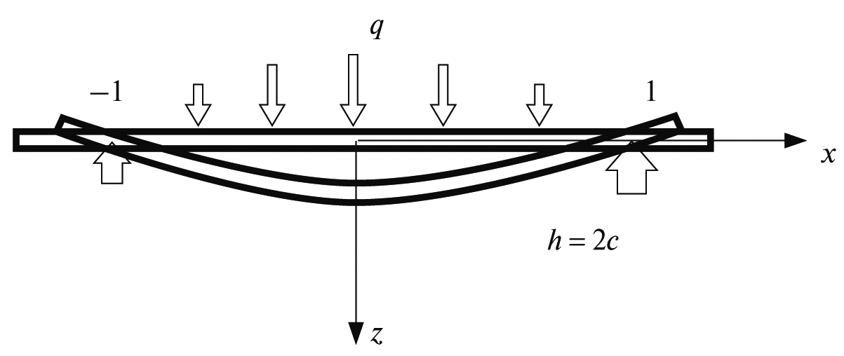 Рис. 1. Изгиб свободно опертой балки, торцы которой фиксированы по вертикали, но могут свободно перемещаться по горизонтали и вращаться. Длина балки L = 2l, толщина h = 2c.