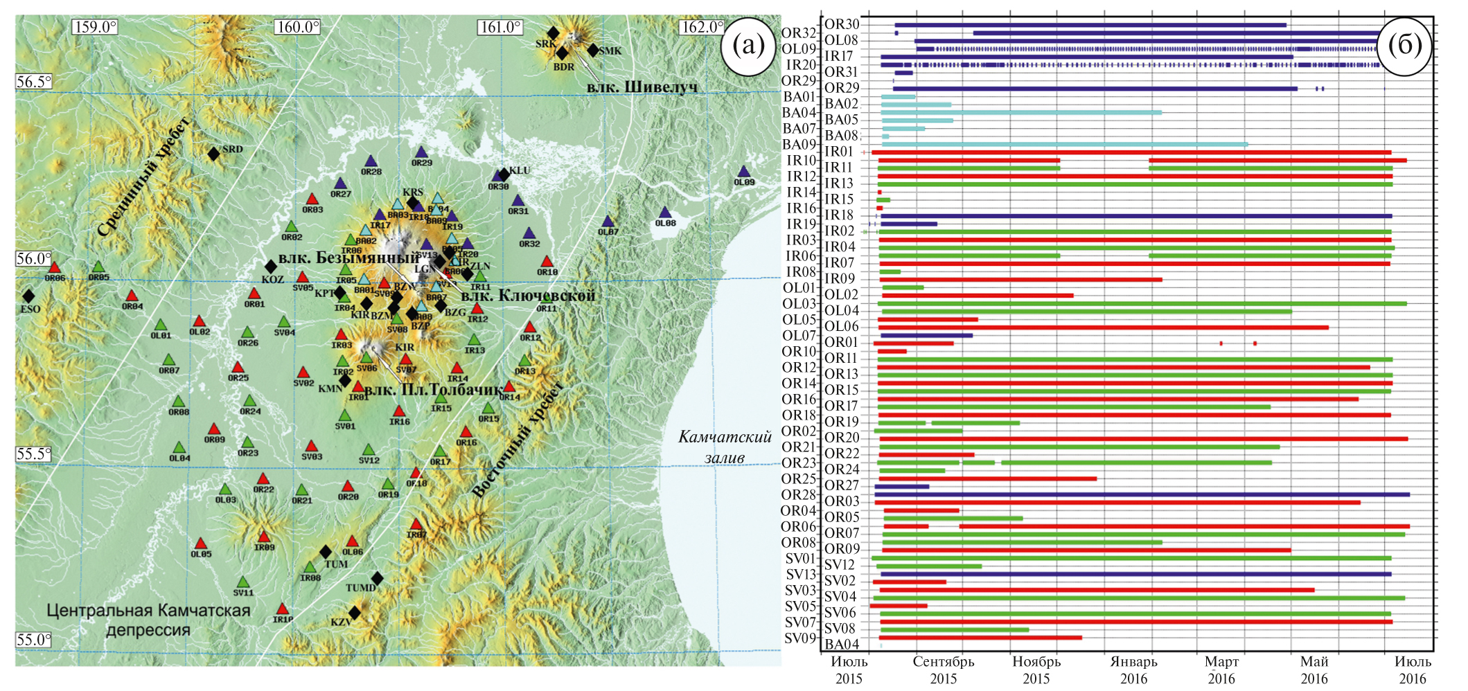 Рис. 1. Расположение станций Камчатской региональной сети (международный код сети – KAGSR) показано черными ромбами, а станций эксперимента KISS – разноцветными треугольниками (а). Периоды работы станций – (б). Цветом показано разное техническое оснащение станций: Trillium Compact с периодом до 120 с (красный); Guralp CMG‐6T и Guralp‐CNG‐6TD с периодом 30 с (синий); CME‐4111 с периодом 30 с (голубой); Mark L‐4C‐3D с номинальным периодом 1 с, который может быть увеличен до 20 с (зеленый).