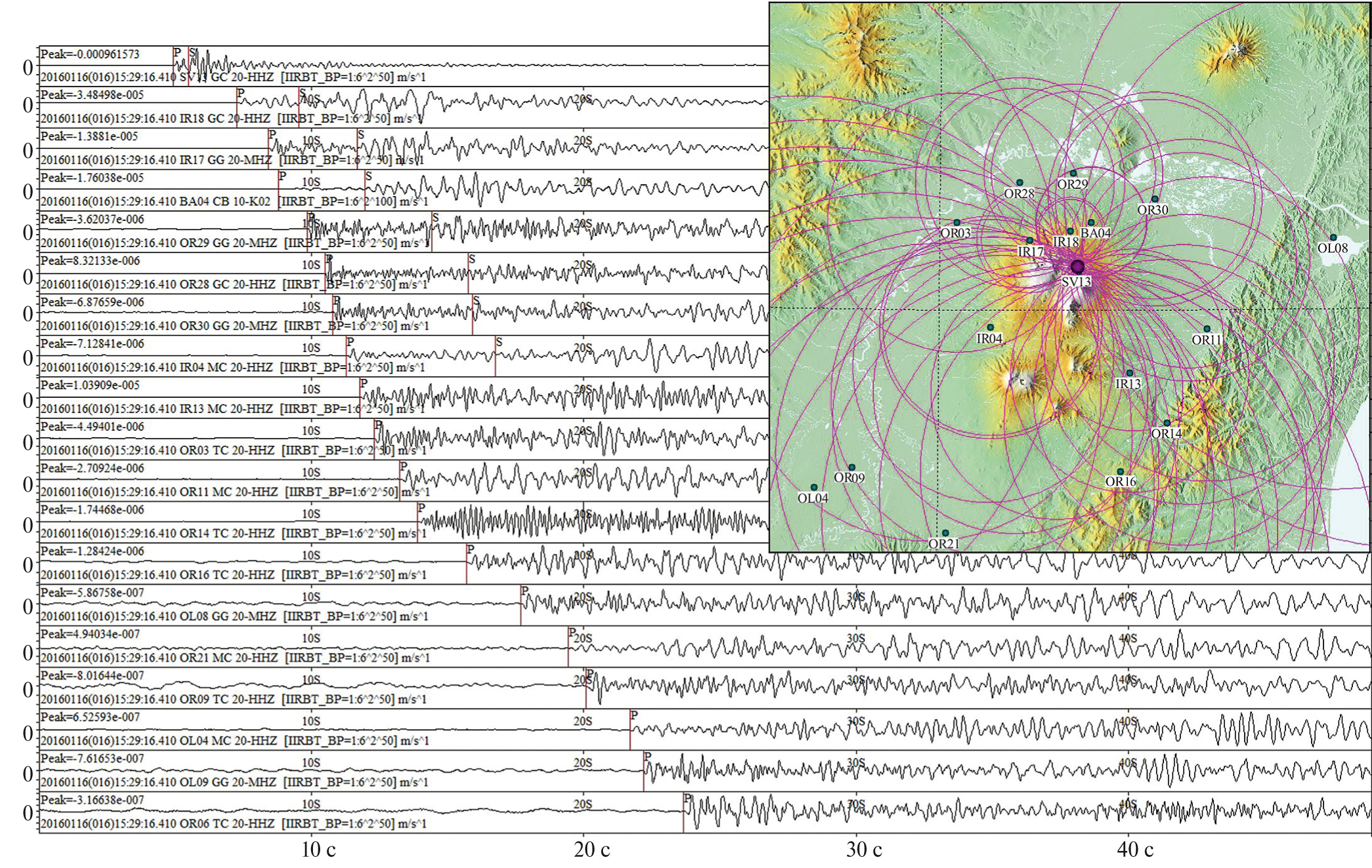 Рис. 3. Пример записи вулканического землетрясения 16.01.2016 г. в 15h 29m в постройке Ключевского вулкана на глубине ∼ (–1) км на нескольких станциях KISS (вертикальные компоненты). На записях отмечены вступления P- и S-волн в процессе обработки в программе DIMAS. Надо отметить, что вступления S-волн отмечаются на горизонтальных каналах, которые здесь не представлены. На врезке показана карта с эпицентром и станциями, записи которых представлены на этом рисунке.